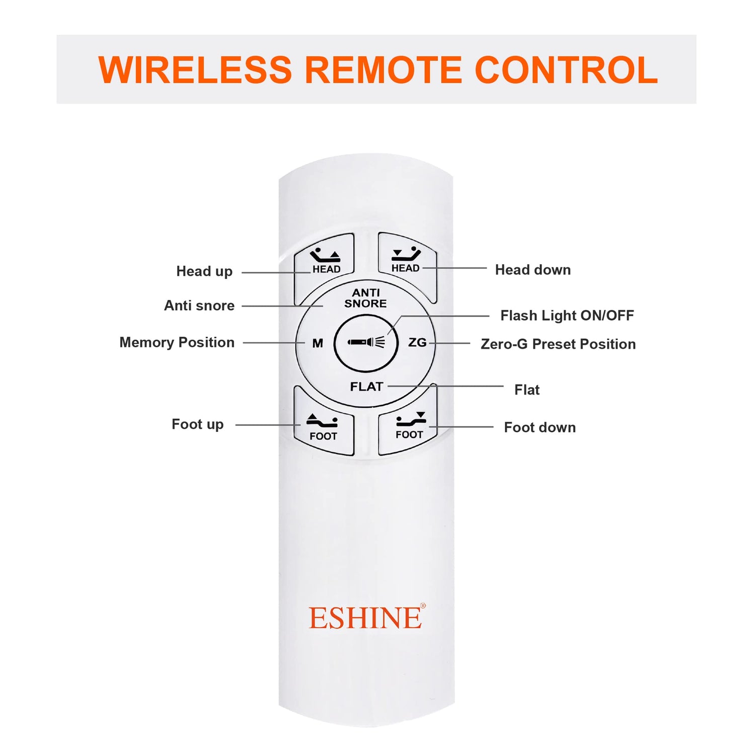- PHONE CONTROL - The ESHINE E2000 adjustable bed frame can be operated by phone. The head and foot incline option which can head to 55 degrees and foot up to 42 degrees . The adjustable bed also can be controled by Wireless Remote control with convenient button.