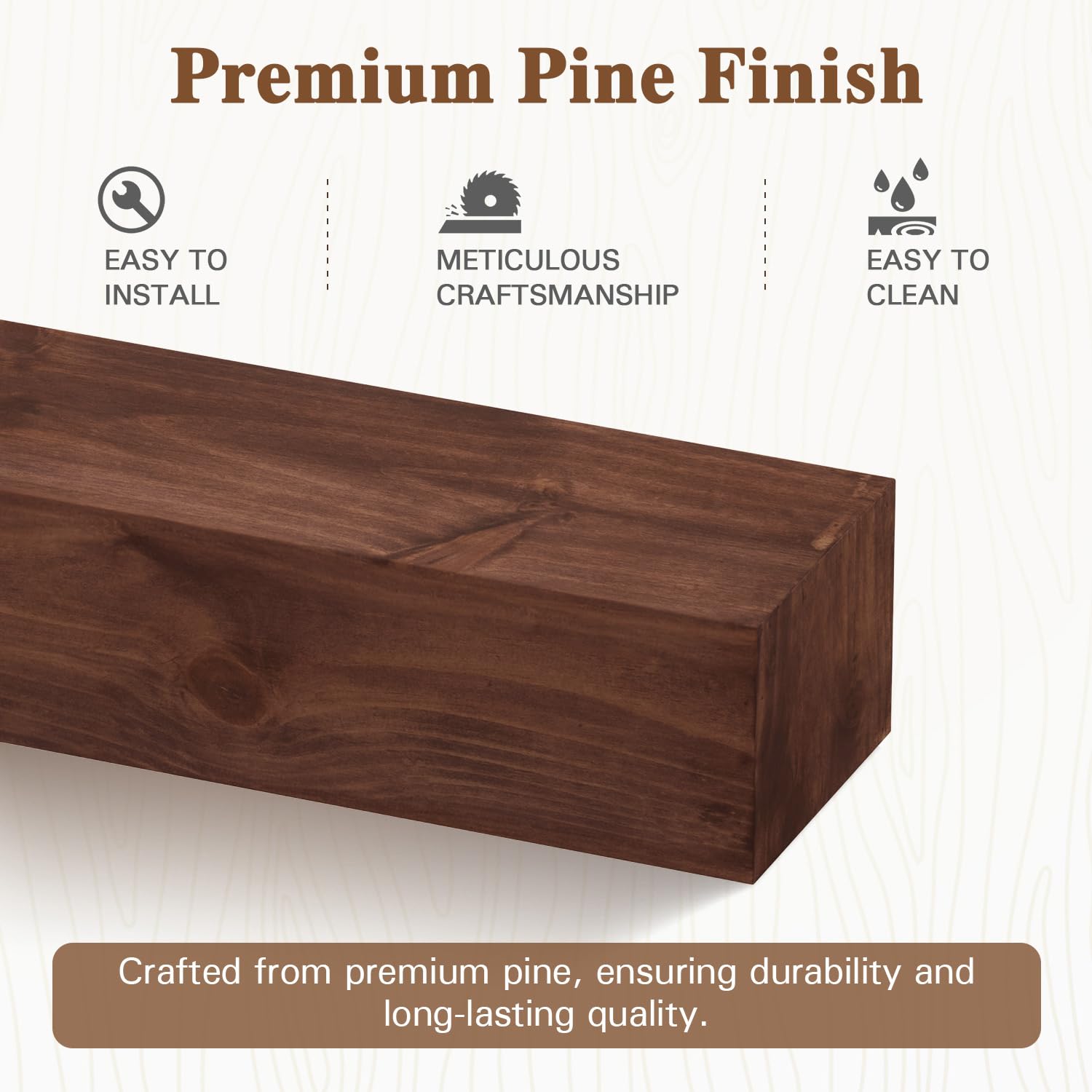 - Solid Strength & Design: Crafted from solid pine, the natural grain of this handcrafted floating mantel shelf adds classic charm to your home. Sealed with a water-resistant finish, it combines rustic beauty with durability.