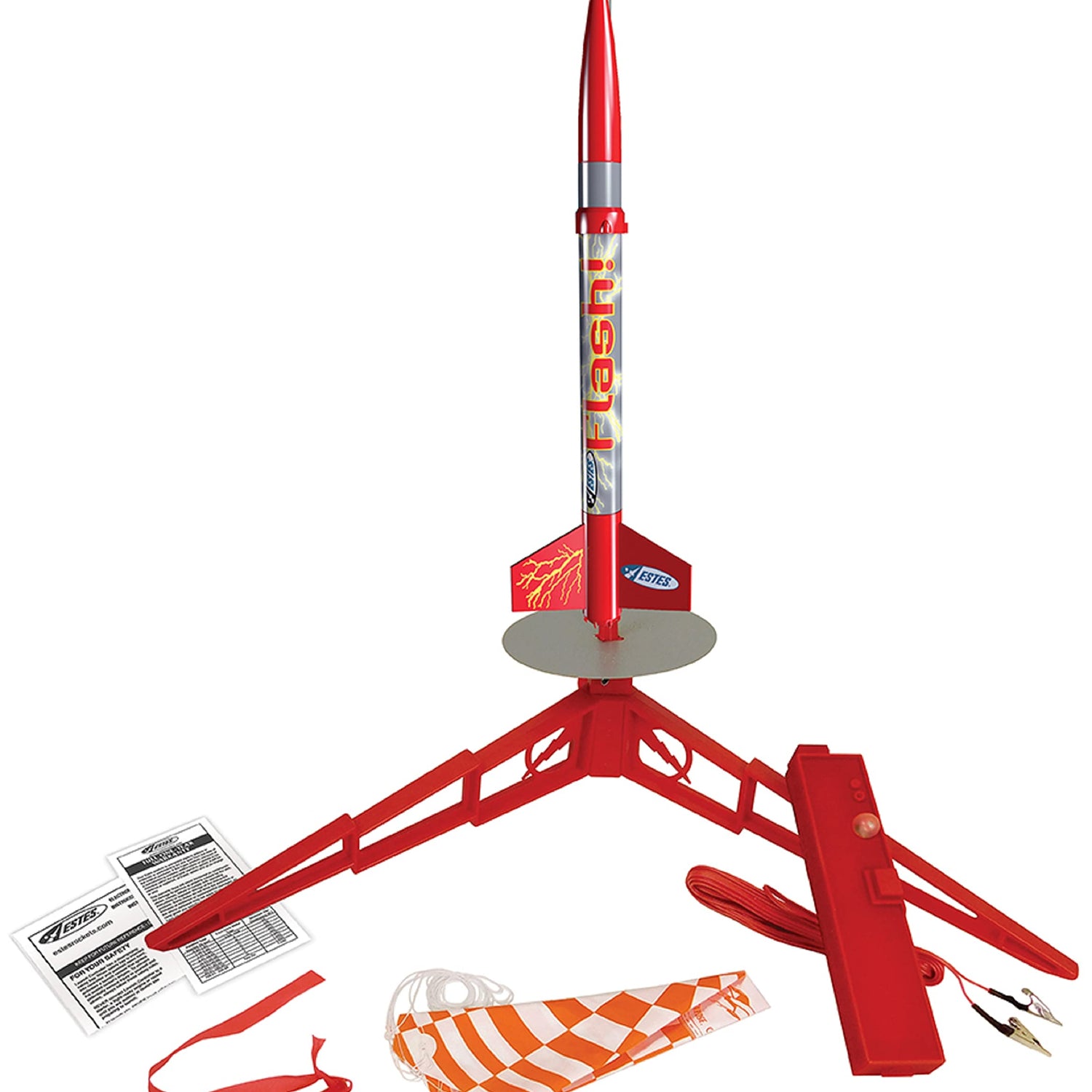 Este rocket activity set is used to launch the Flash model rocket, which has a drag-resistant design for providing high performance, with cloud-base flights over 925.0 feet/282.0m on a standard Estes engine (sold separately). The rocket has a snap-together, plastic molded fin set with a nose cone, an attachable pre-colored body tube, and die cut, self-stick decals for ease of assembly. The set includes a launch pad and controller for discharging the rocket, which measures 16.2”/41.2cm (L). (L is length, the horizontal distance from left to right.) For operation, the set requires a model rocket engine, igniter, and recovery wadding, which are sold separately. Tools and construction and finishing supplies must also be purchased separately. The set is suitable for age 10 and older, with adult supervision for children under age 12. Specifications Length*16.2”/41.2cmDiameter1.1”/28.0mmEstimated weight1.8 oz./52.0gAssemblyQuick snapRecovery parachute12.0”/30.5cm diameterSuitable enginesA8-3 (First Flight), B4-4, B6-4, C6-5, C6-7Projected maximum altitude925.0 feet/282.0m