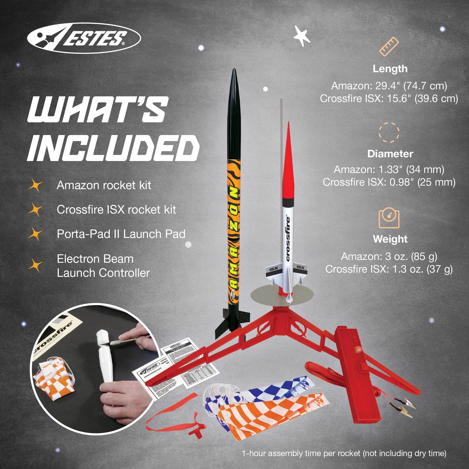 - BEGINNER MODEL ROCKET LAUNCH SET: This Estes rocket model launch set offers adults and kids ages 10+ the chance to build and launch our Amazon and Crossfire ISX rocket models. This set includes the easy-to-assemble Amazon model parts, the intermediate level Crossfire ISX model parts, parachutes, and the launch pad system. It requires rocket engines, Starters, Recovery Wadding, and 4 high-quality 1.5-volt AA alkaline batteries for launch use (sold separately).