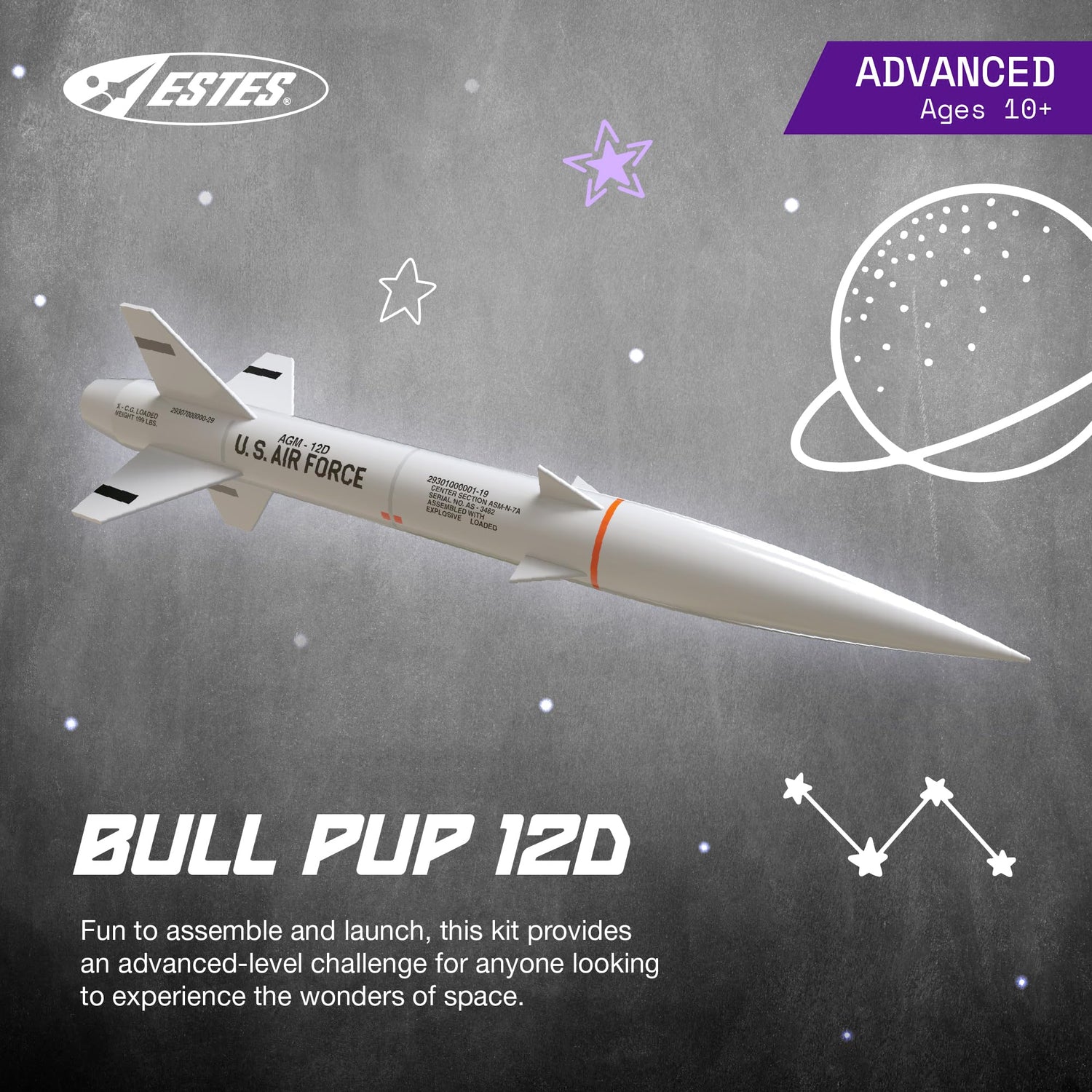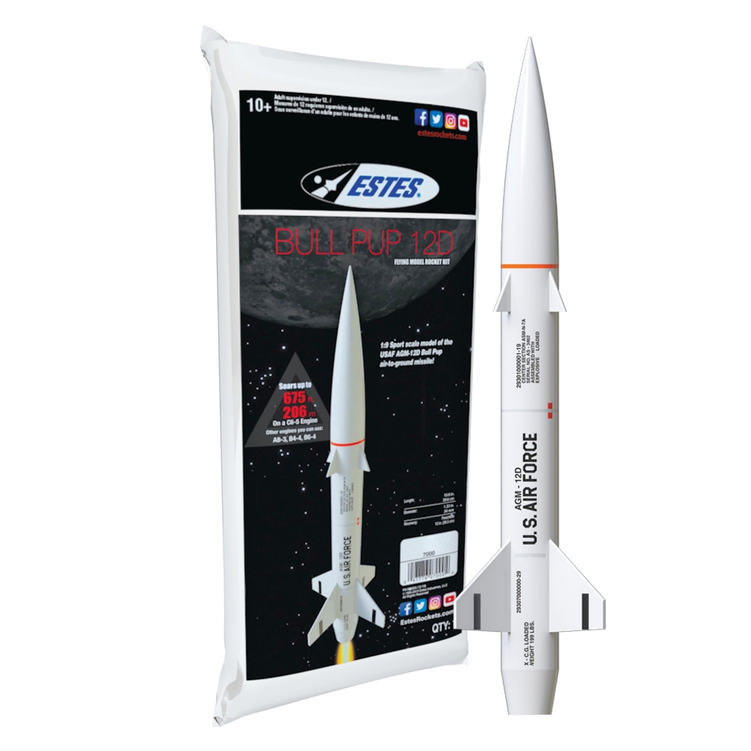 • ADVANCED MODEL-ROCKET-BUILDING KIT: The 7000 Bull Pup 12D rocket model kit allows ages 10+ and advanced rocket-building enthusiasts to create a highly detailed version of the USAF AGM-12D Bull Pup air-to-ground missile. It includes the rocket parts, design decals, a recovery parachute, and instructions. It requires rocket engines, Starters, Recovery Wadding, a launch pad system, and 4 high-quality 1.5-volt AA alkaline batteries for launch use (sold separately).
