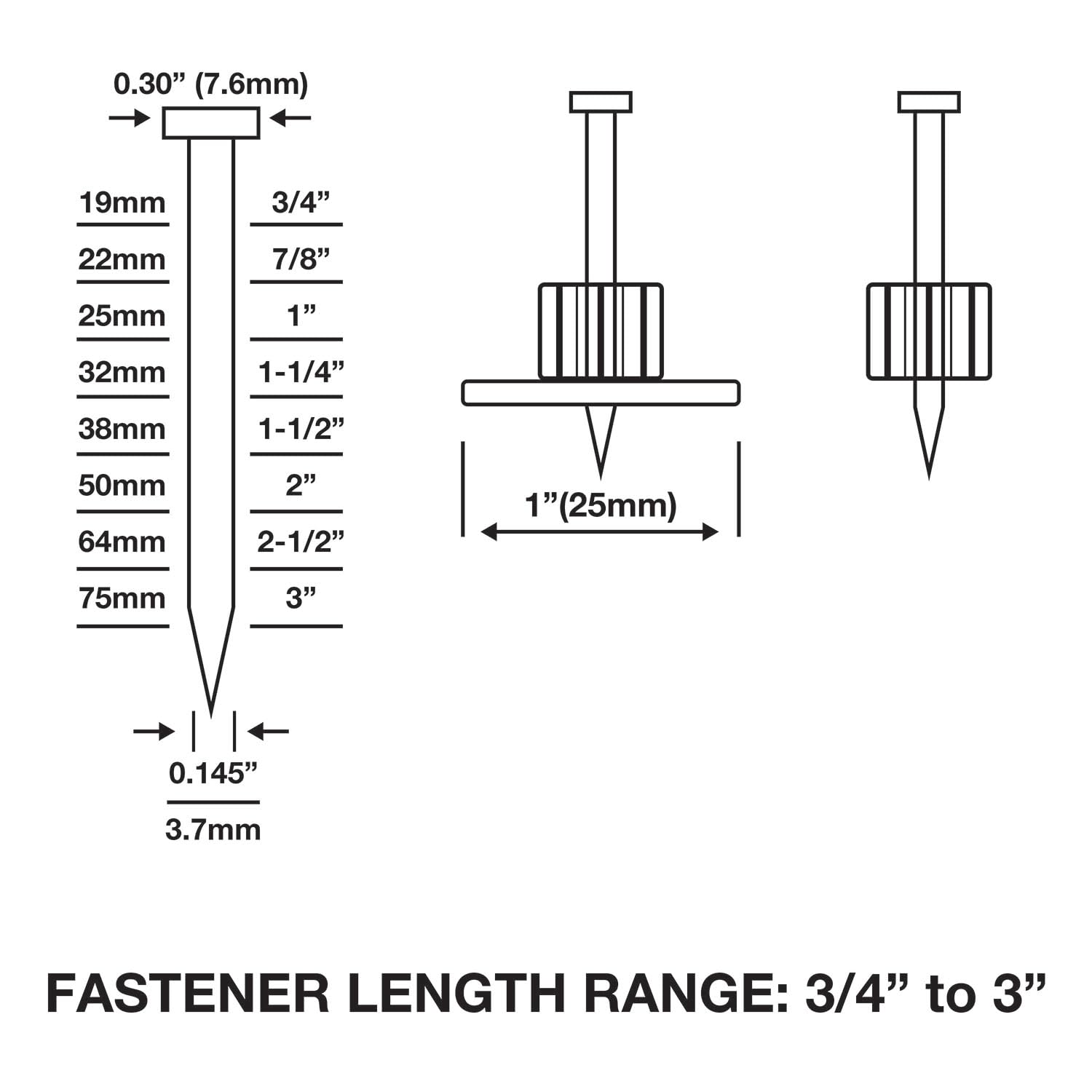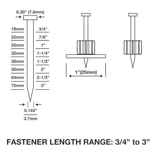 - Compatible Nails: Single concrete pins from 3/4" – 3" and 0.145" diameter, including Freeman, Ramset and Hilti