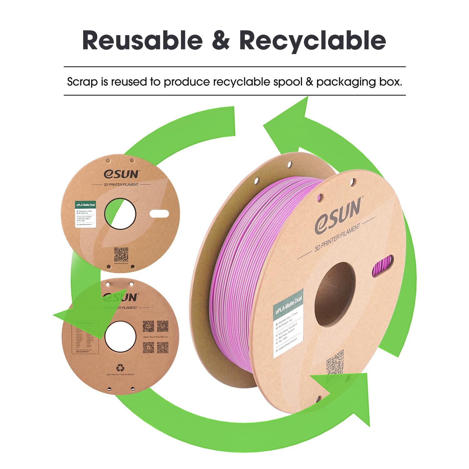 - 【High Toughness & Good Adhesion】Compared to normal PLA filament, eSUN Dual Color Matte PLA has higher toughness.Printed models are not easy to break or crack, which can be widly used in accessory, home decoration, toy, sculpture, shell and COSPLAY. Compatible with Most of FDM 3D Printers, such as: Bambu Lab P1P / P1S / X1 / X1C / A1 / A1 mini, Voron 2.4, Raise3D, Prusa, Creality Ender 3 and Ender 7.