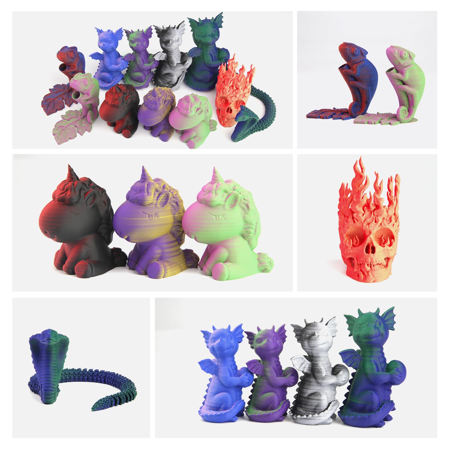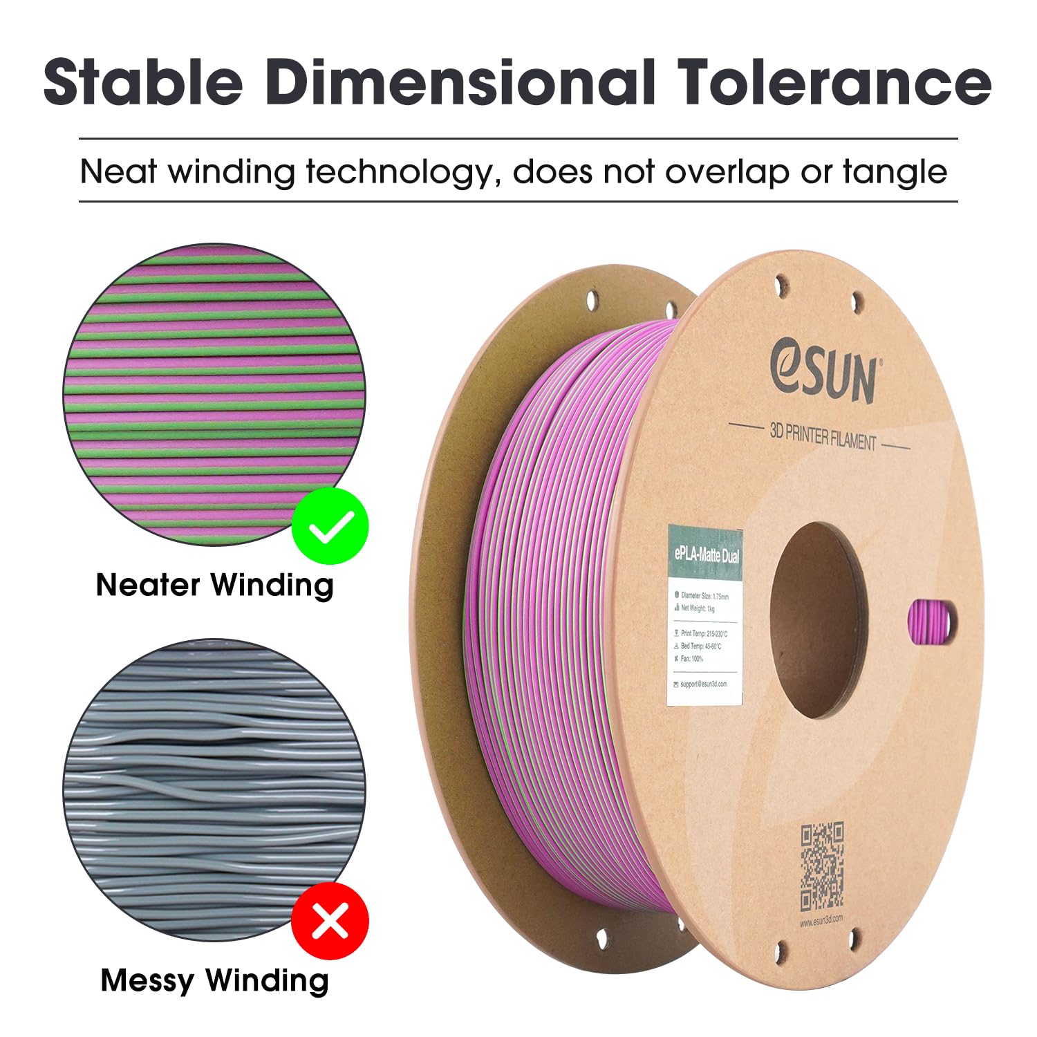 - 【Delicate Dual Color Matte PLA】With excellent matte printed surface, eSUN Dual Color Matte PLA has dual color coextrusion printing effect and displays a sense of color hierarchy while maintaining color separation, making the appearance of the model both rich and delicate. It doesn't have obvious layer lines than normal PLA. Not easy to break. Supporting structure of it is easy to peel off.