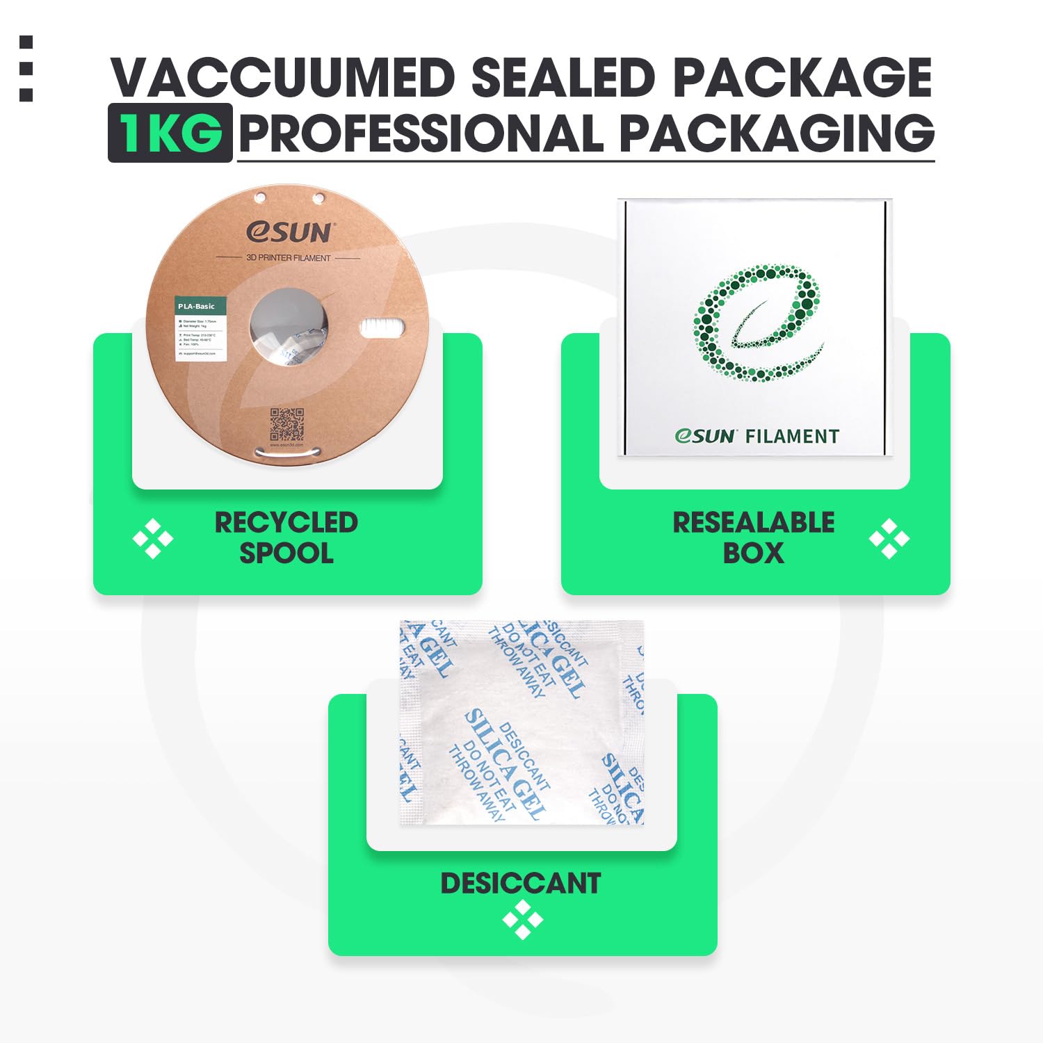 - 100% Vacuumed Sealed Packaging: Complete drying for 24 hours before packaging, eSUN filament comes in a sealed vacuum bag with a desiccant bag to keep it dry and prevent from dust and foreign particles, avoid nozzle jams and yield smooth 3D models.