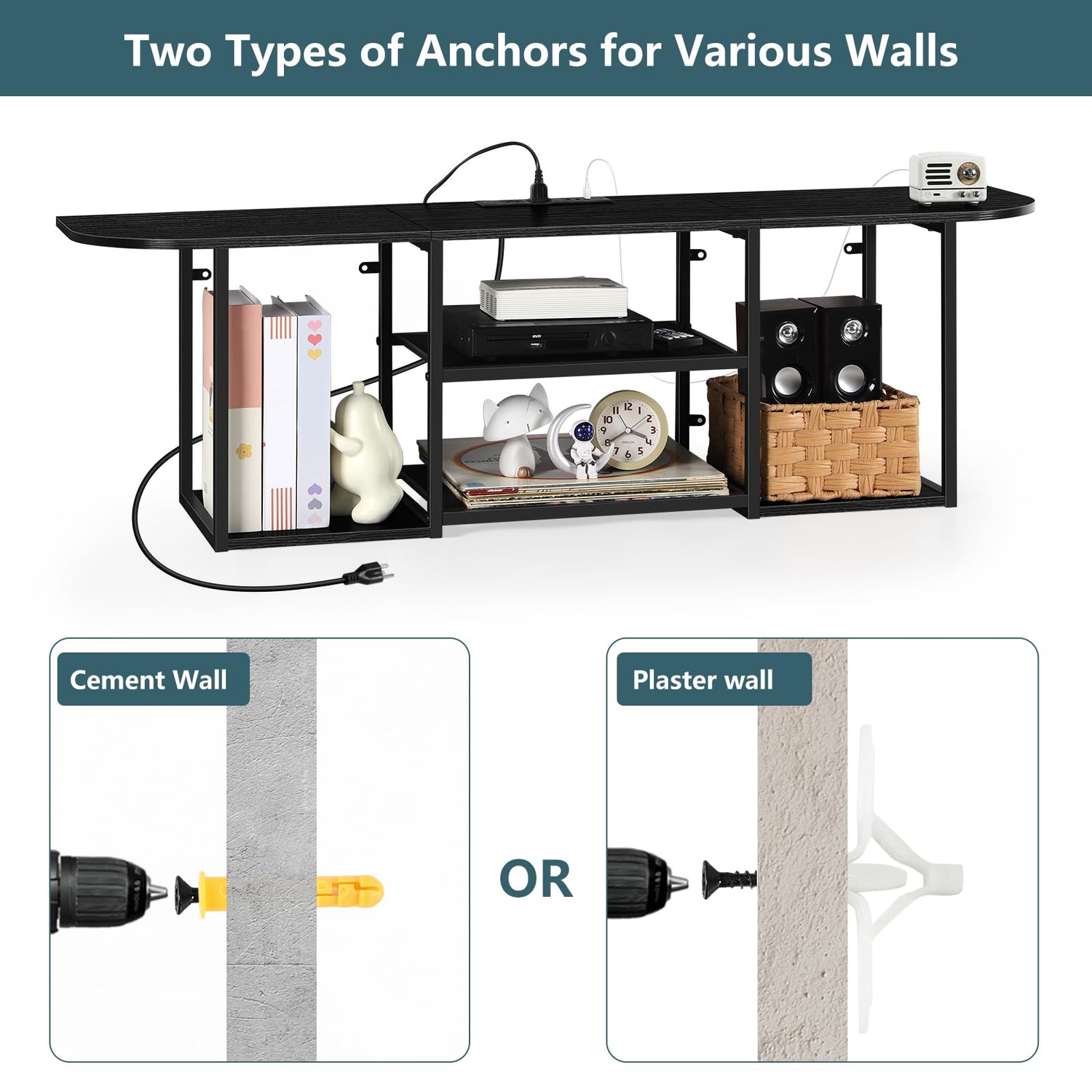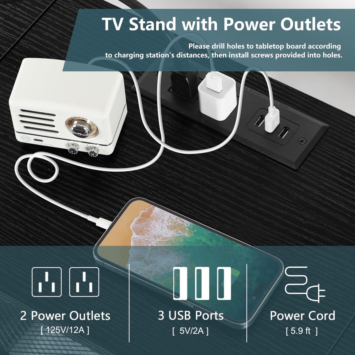 - 【Floating TV Stand with Power Outlet】Product Dimensions: 11.8"D x 47.2"W x 14.3"H. Suitable for TVs up to 50″. The charging station of floating tv stand wall mounted includes two 3-prong AC outlets(12A/125V) and 3 USB ports(2A/5V), meeting your needs to charge your phone, desk lamp, and TV. The length of power cord is 5.9 feet. For charging station's installation, please drill holes to tabletop board by yourself according to charging station's distances, then install screws provided into holes.