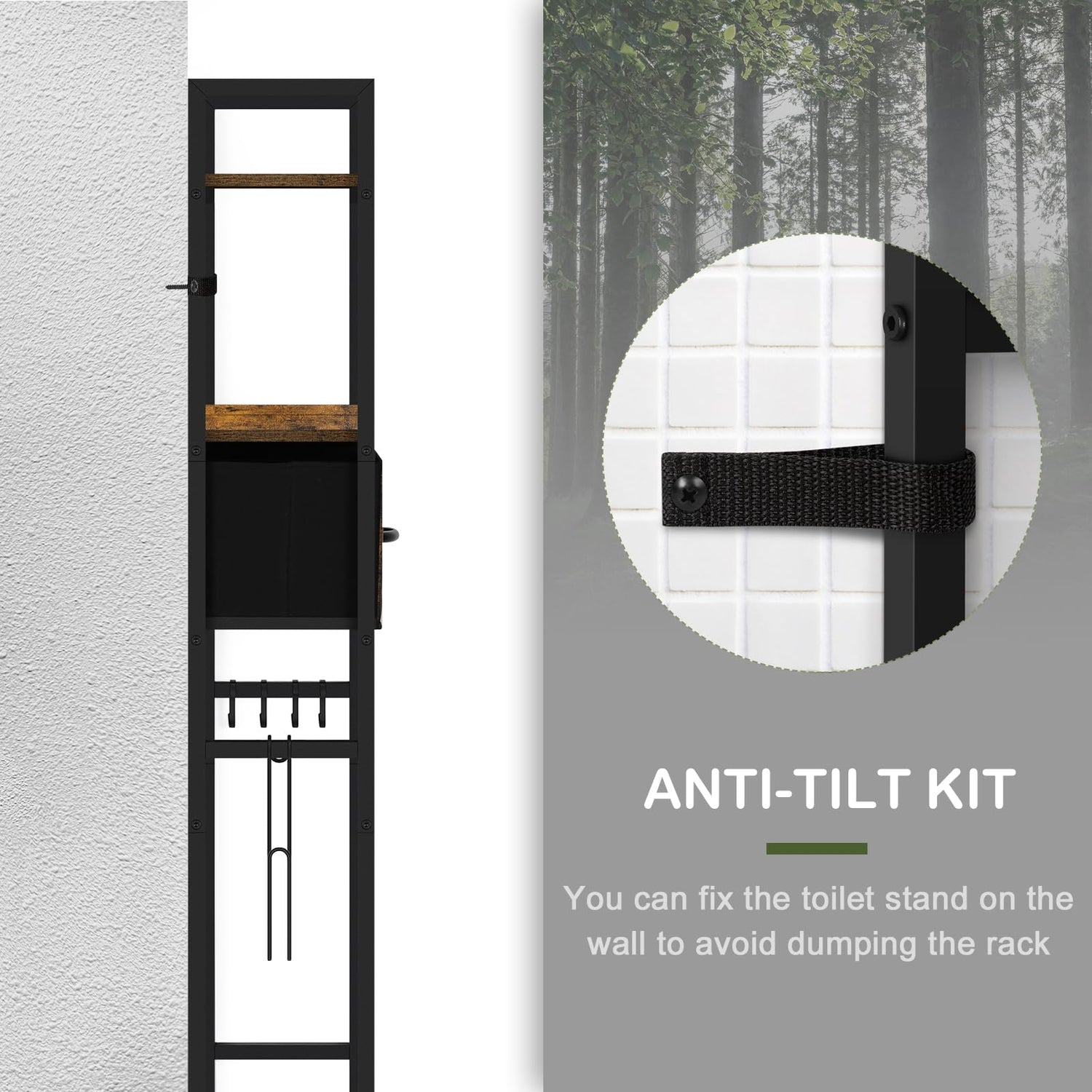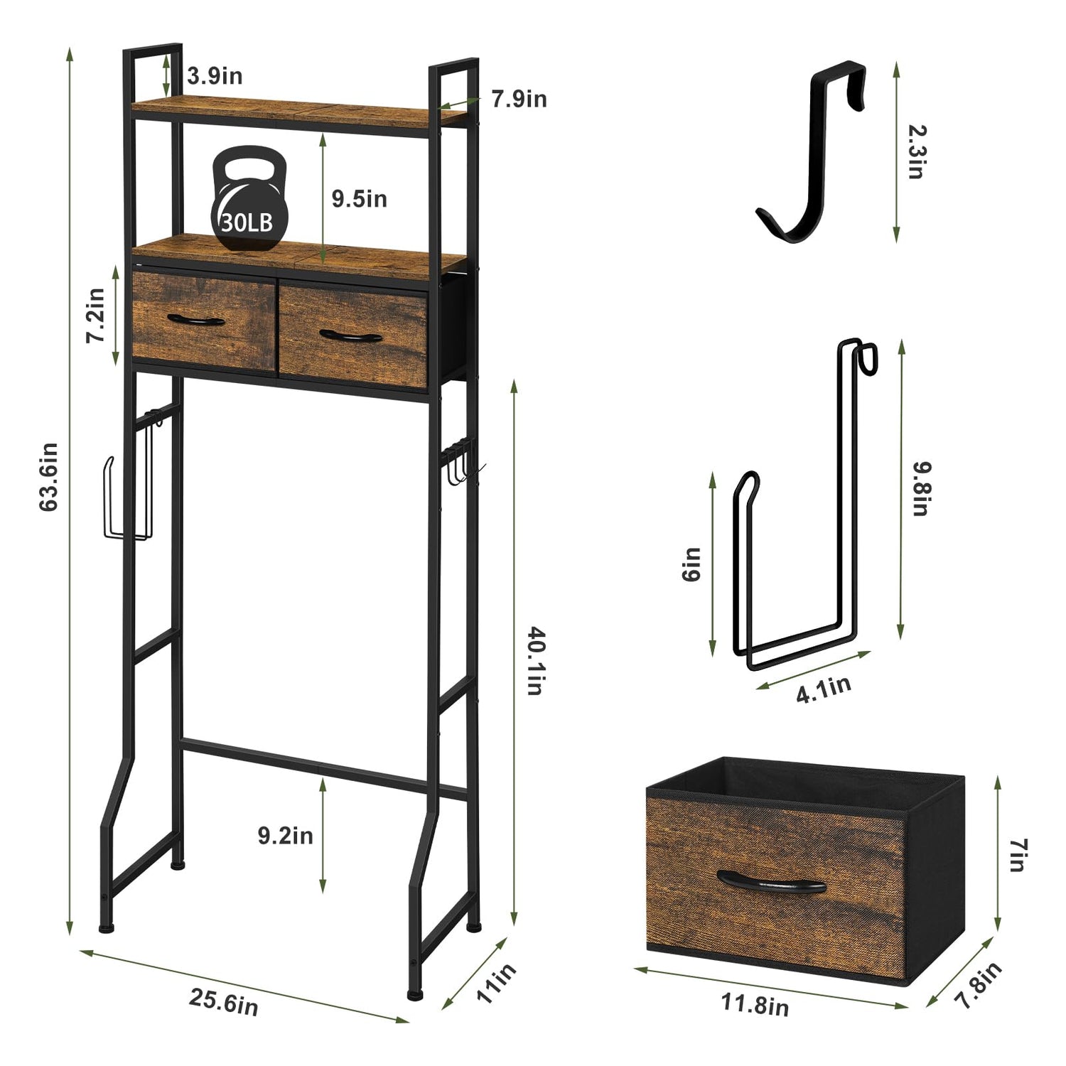 - 【Toilet Paper Holder & Hooks】 Our toilet storage rack also offers 4 detachable stainless steel hooks, and a toilet paper holder , this over the toilet shelf provides abundant space for storing bathroom essentials like towels, toiletries, perfume, shaving foam, brush, shampoo, and potted plants.