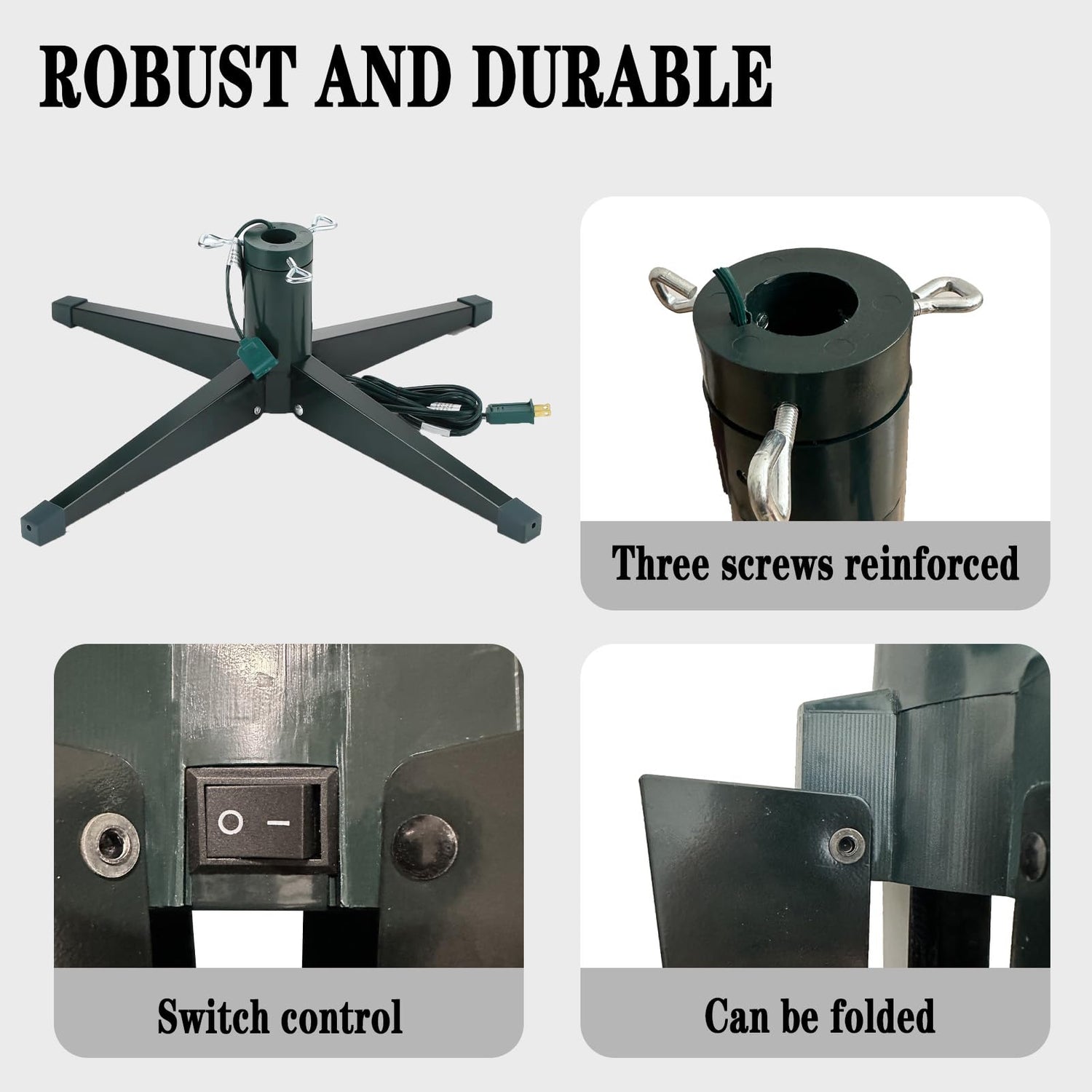 - 360-DEGREE ROTATION:The 360-degree rotation feature allows every Angle of the tree to be seen without manual adjustment. For Christmas trees decorated with lights, the rotation function allows the lights to be evenly displayed to enhance visual appeal.