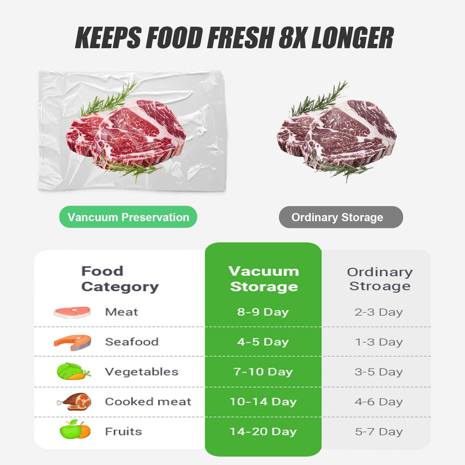- ๐๐๐ง๐ฆ๐๐ญ๐๐ก๐๐ ๐๐๐๐ฎ๐ฎ๐ฆ โ ๐๐ฑ๐ญ๐๐ง๐ ๐ ๐ซ๐๐ฌ๐ก๐ง๐๐ฌ๐ฌ: Experience 60KPA suction capability that swiftly vacuums your food in just 8-12 seconds, extending its freshness up to 8 times longer. The advanced vacuum system features both automatic and manual settings, perfect for handling a range of textures from crisp and hard to delicate. The external VAC- feature takes it a step further, allowing you to seal jars, canisters, and even wine, reducing oxidation and evaporation for prolonged freshness.