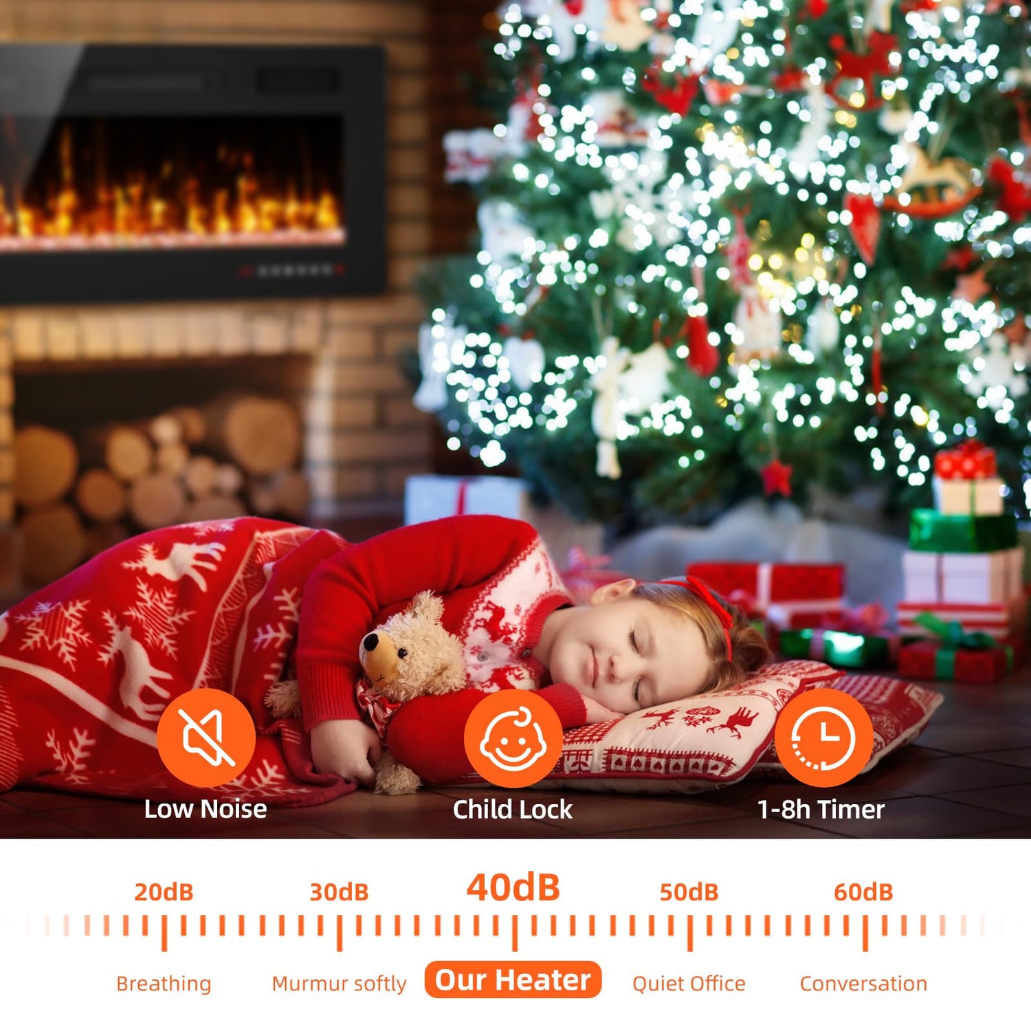 - Efficient & Slim Design: You can choose the temperature you want from two modes: 750W or 1500W. This fireplace is only 3.2 inches thick, which means it won’t take up much space in your room. It is 20% thinner than other fireplaces, making it easy to install and use. This fireplace will help you save money and space while enhancing your comfort and style