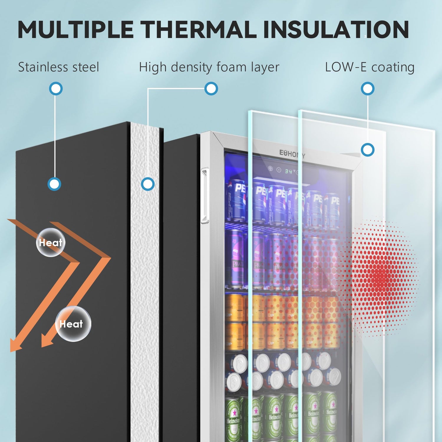 - lNTELLIGENT CONTROL - Euhomy Beer and Wine Chiller offers a variable temperature selection ranging from (34°F to 61°F) to meet your multiple storage options. The digital display allows you to easily monitor and set whatever temperature you need. Unlike most beverage coolers, Euhomy’s beverage cooler use air-cooled frost-free technology, so all you have to do is enjoy your beverages