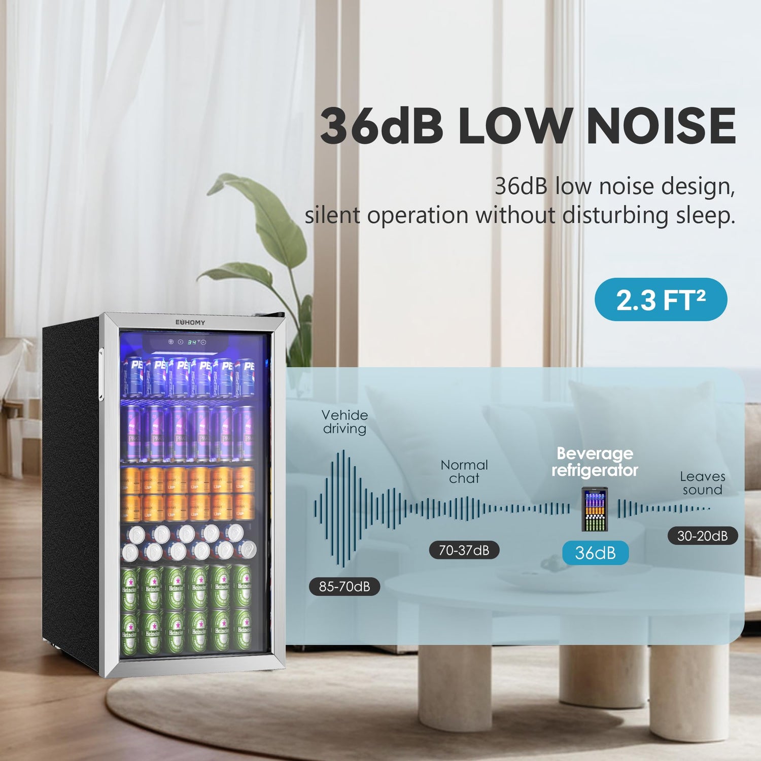 - QUIET + ADVANCED COOLING SYSTEM - With a powerful compressor and internal air-cooled system, Euhomy’s mini fridge creates an evenly cooled space by ensuring that air flows throughout the entire beverage center.In addition, ultra quiet cooler of beverage cooling machine doesn’t affect your daily rest or working. With our cooler, you won’t just enjoy cold drinks, you’ll have a quiet atmosphere too