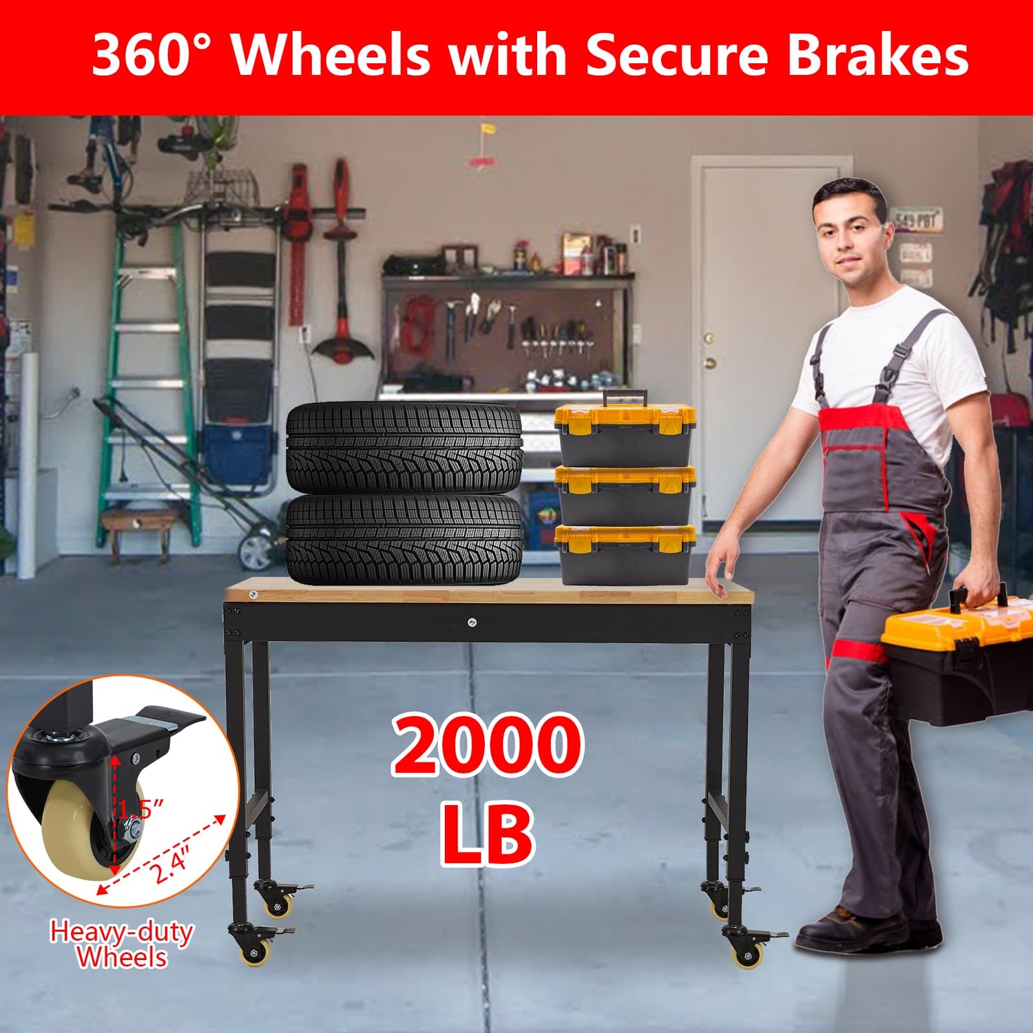 EuKer Workbench 48x24 Inch, Adjustable Height Worktable for Garage, Rubber Wood Top & Cold-Rolled Steel Table Workbench, Heavy Duty Workstation with Power Outlets & Wheels, 2000 Lbs Load Capacity