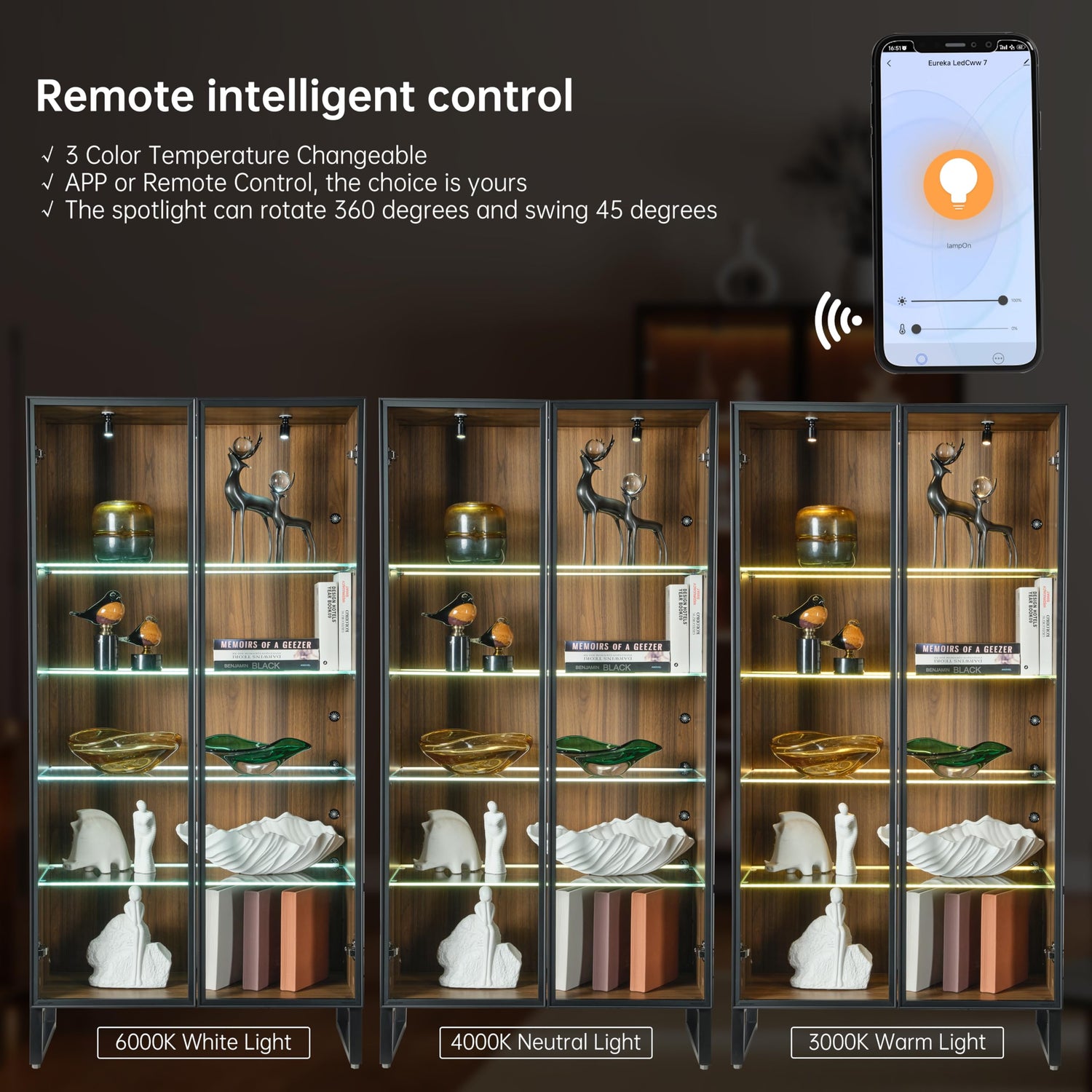 - Adjustable LED Light: EUREKA display cabinet can remotely control the color temperature and brightness of the light through the APP or remote control, and there are 3 light color temperature options to meet your lighting needs: warm light, neutral light, and white light. The 3 small spotlights on the top support a wide range of adjustable direction, 360-degree rotation and 45-degree swing. Simply plug in and illuminate your gorgeous collection and your treasures at any time of the day!