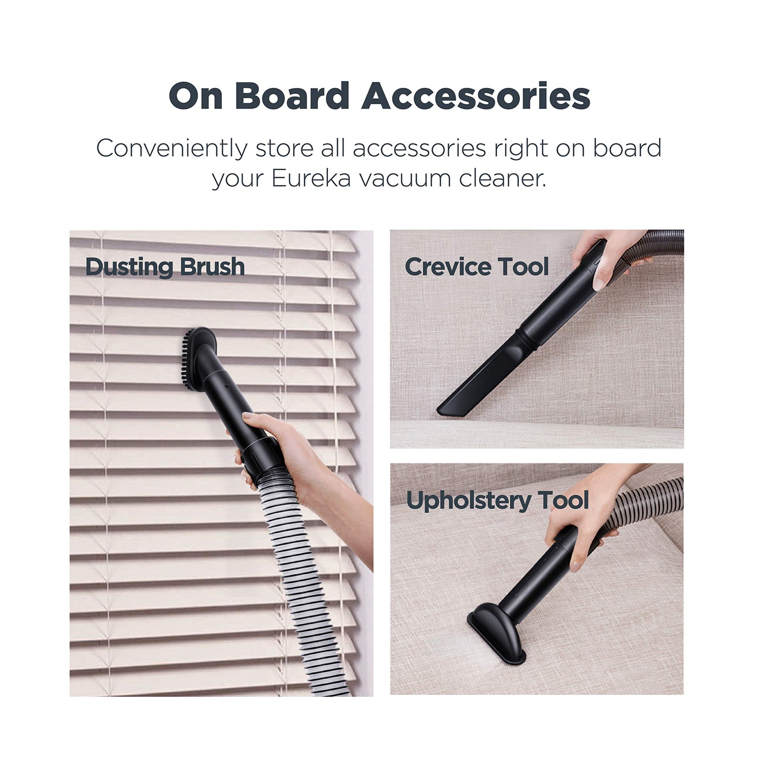 - Multiple accessories included a quick-release handle connected to the stretch hose for above-floor cleaning A 7-inch-long crevice tool, dusting brush and upholstery tool help clean hard-to-reach areas Extract dirt, pet hair freshen up your car curtains ceilings or door frames For your convenience they are all stored right on board