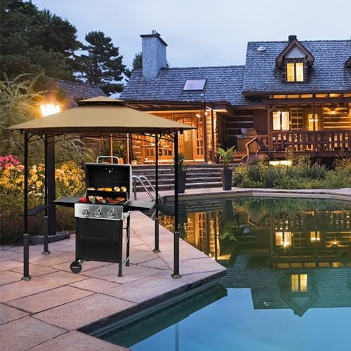 Eurmax USA 5x8 Grill Gazebo Shelter for Patio and Outdoor Backyard BBQ's, Double Tier Soft Top Canopy and Steel Frame with Bar Counters, Bonus LED Light X2(Khaki)