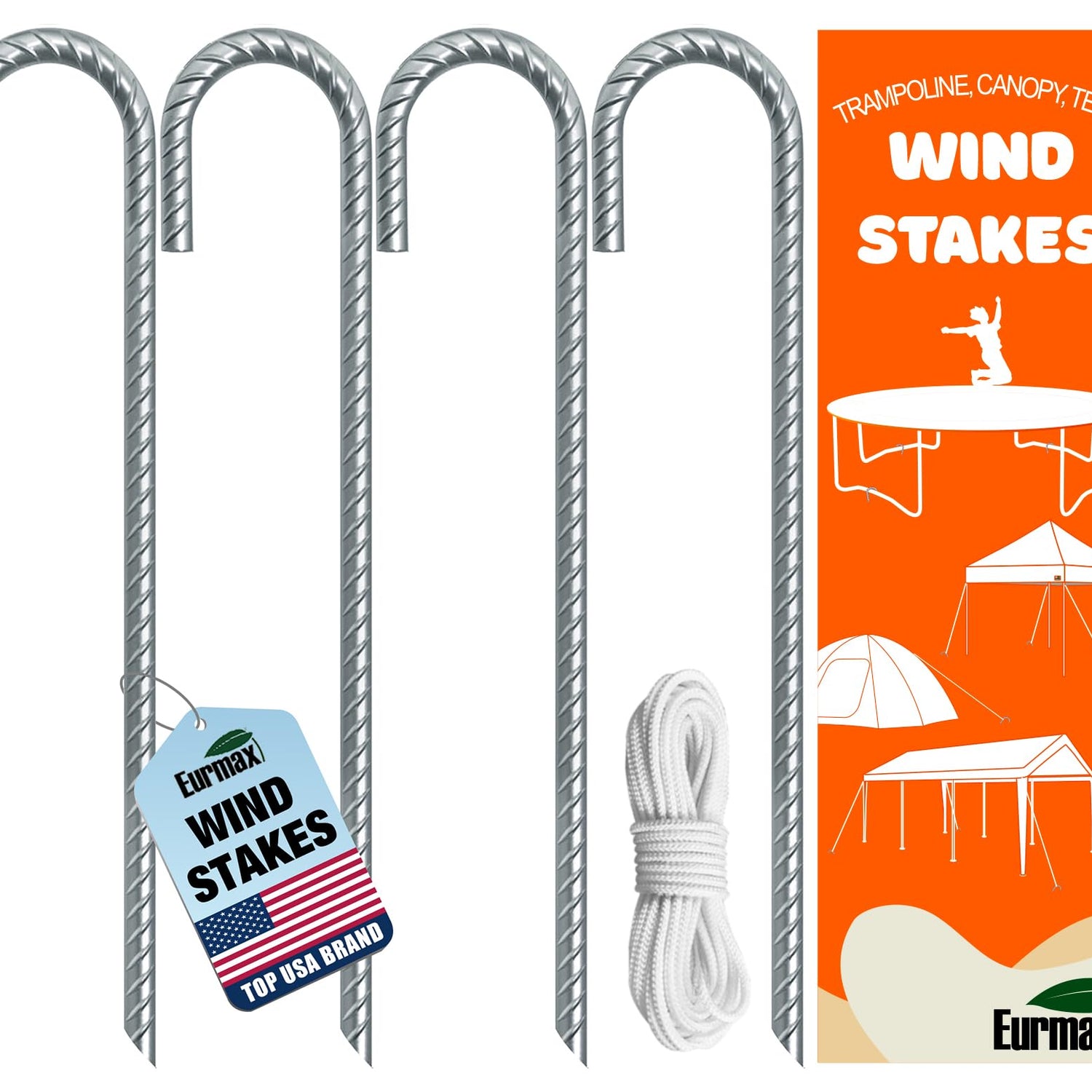 Eurmax USA Trampolines Stakes Heavy Duty Ground Stakes Canopy Parts Wind Stake with Rope 12 Inch Heavy Duty Stake Safety Ground Anchor Galvanized Steel J Shaped, Pack of 4(Gray)