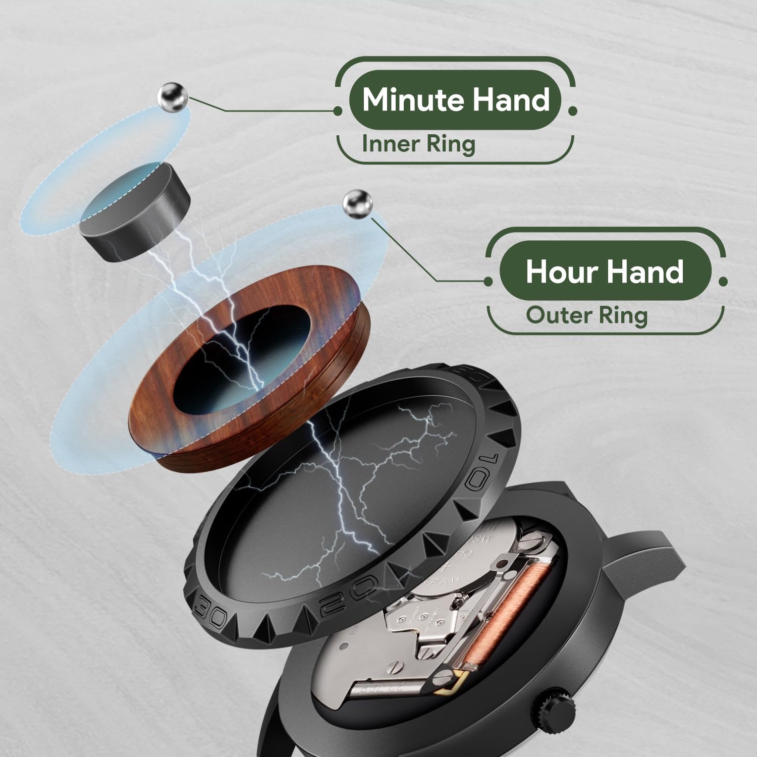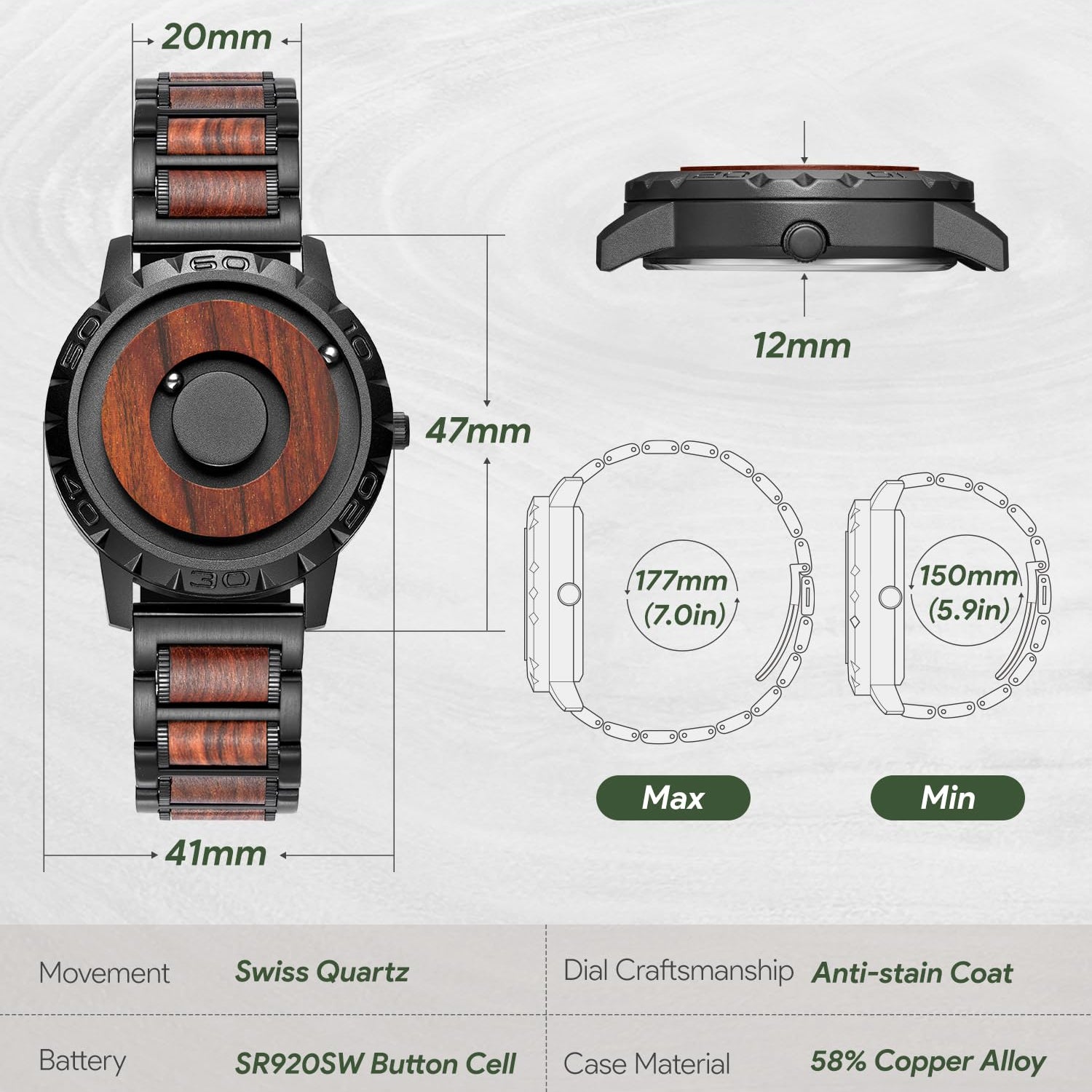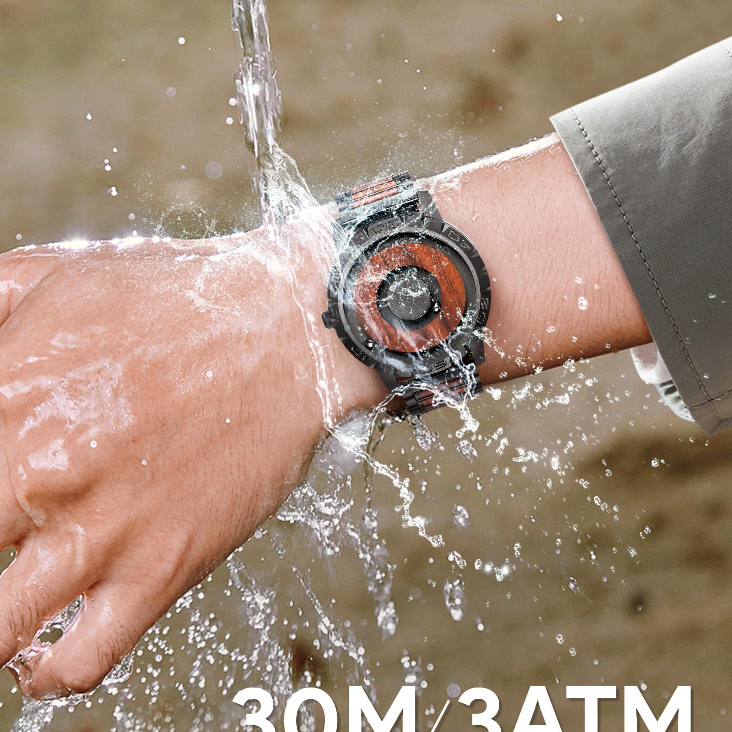 - Futuristic Men's Watches: 2 spheres float above the 40mm dial with a 20mm adjustable Wood strap - inner=minute, outer=hour, breaking convention and ensuring time accuracy & strong magnetic force with a unique fashion design