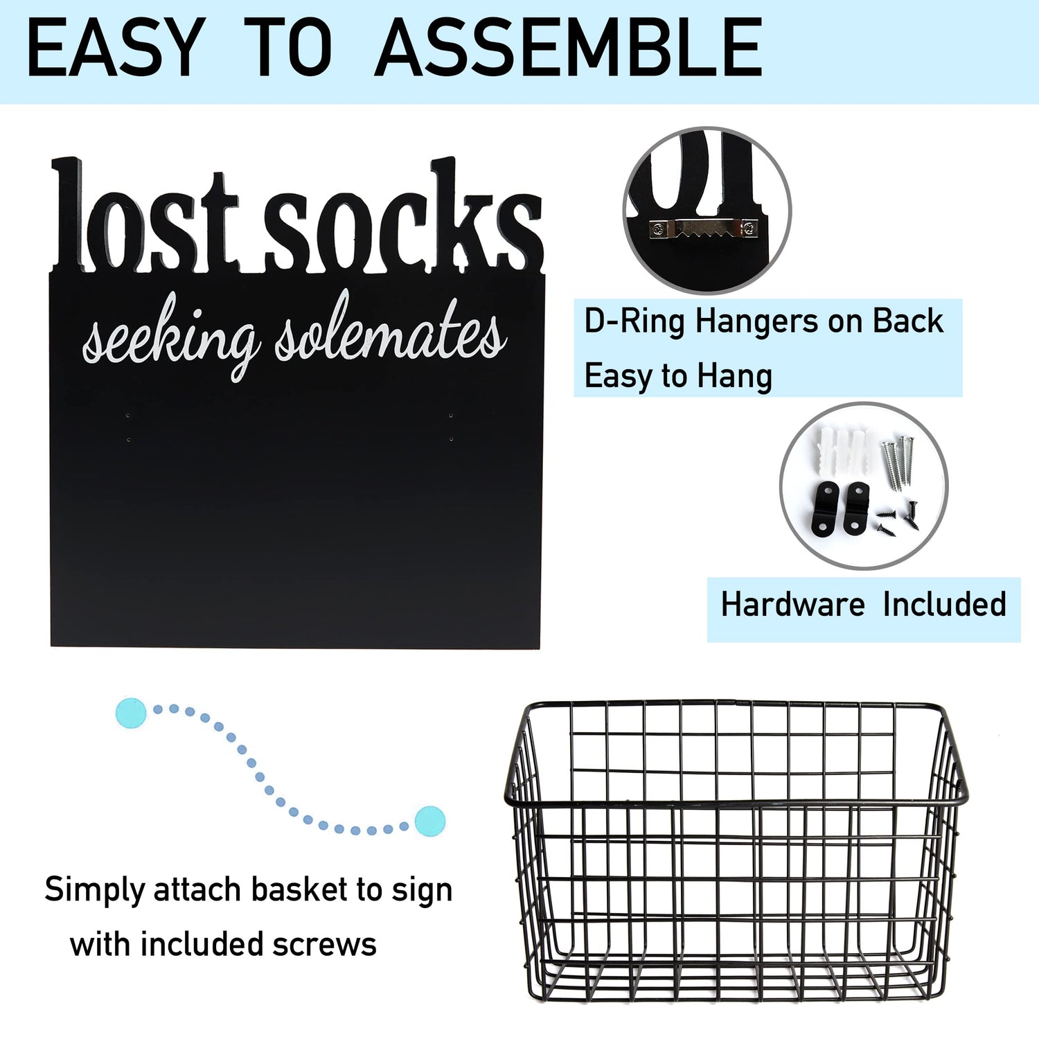 - Easy to Assemble - Easily mount the lost socks basket to our wooden lost socks laundry sign with the included hardware kit. It also can easy to hang on the wall with the back of a sawtooth hanger.