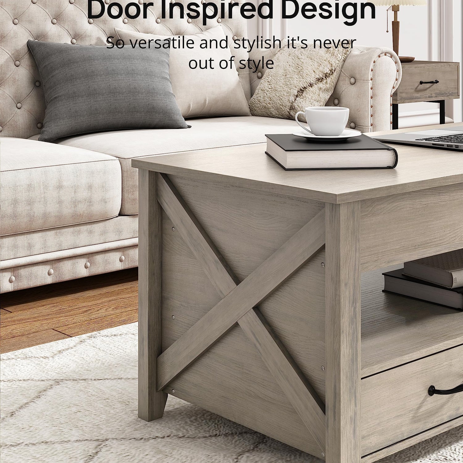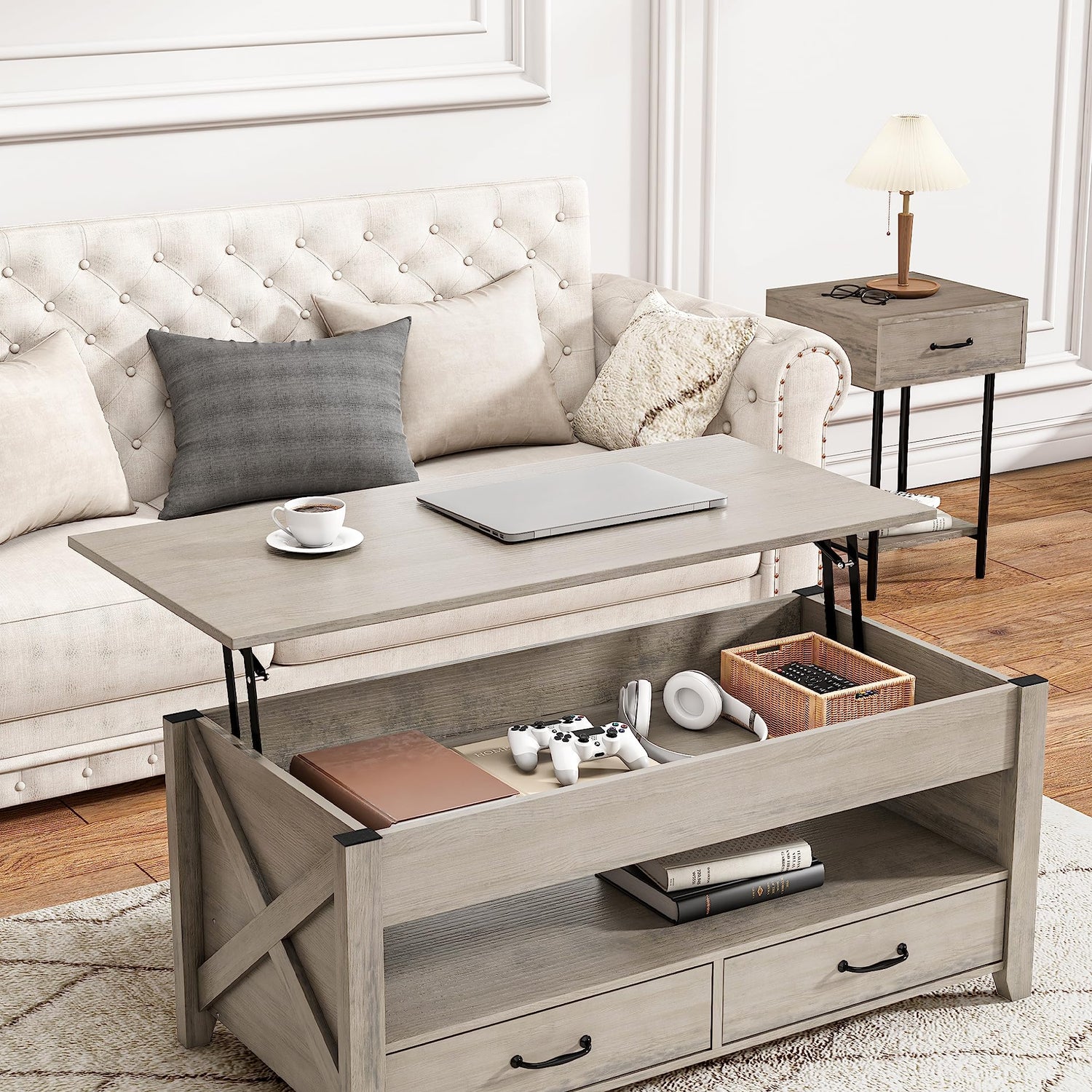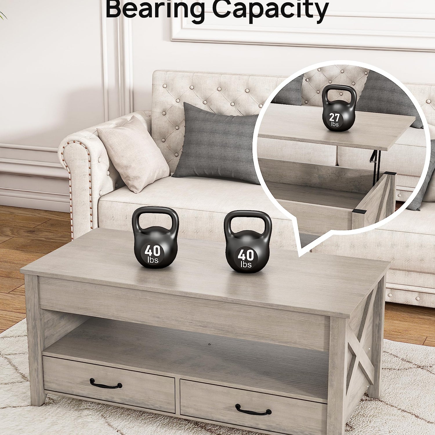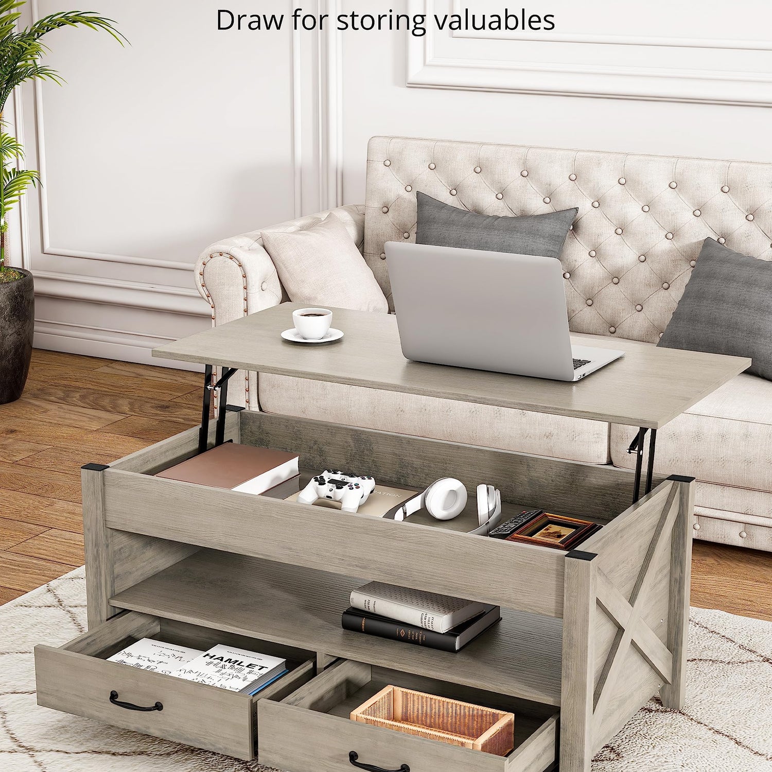 Evajoy Lift Top Coffee Table, Modern Coffee Table with 2 Storage Drawers and Hidden Compartment, X-Shape Wood Support, Center Table with Lift Tabletop for Living Room, Office,Grey,16.9''x41.3''x18.1''