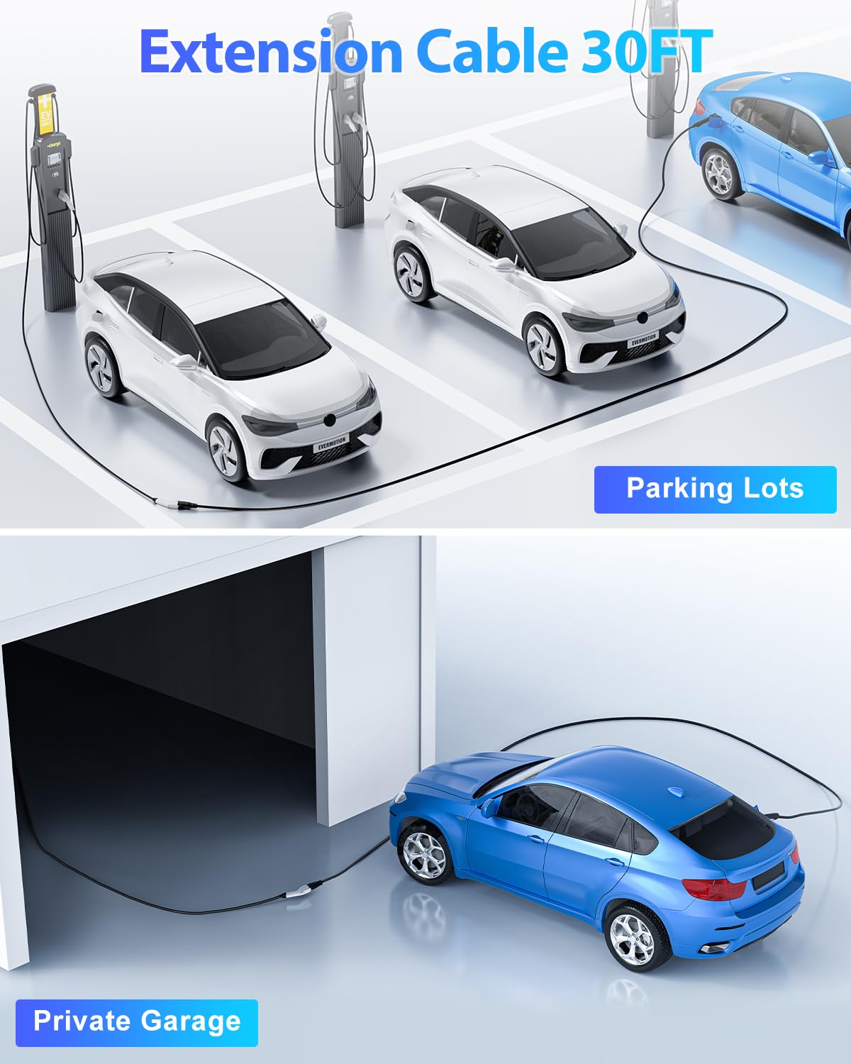 - Powerful 40Amp with 30FT Cable: With support for up to 40 amps charging, this extension cord comes with a heavy-duty 30FT outdoor cable, offering both power and reach to efficiently charge your electric vehicle.