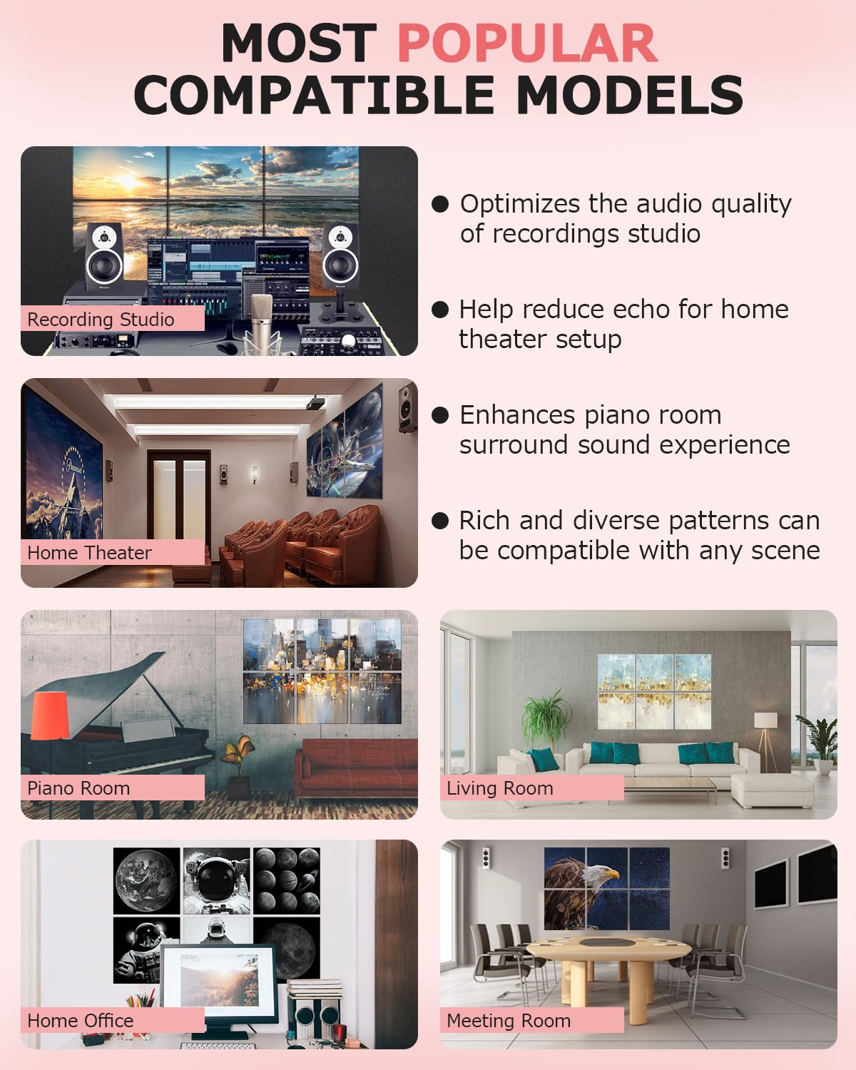 - [EFFCIENT ABSORPTION] The acoustic art you're looking for --- if you're serious about acoustic, stay away sound proof foam panels.,stay away from acoustical wall panels.NO certified! Our acoustic art panels provide excellent sound absorption, minimizing reverberation and echoes,remove sound impurities, improve sound effects, and improve language clarity. It is very suitable for places with higher requirements on acoustics.
