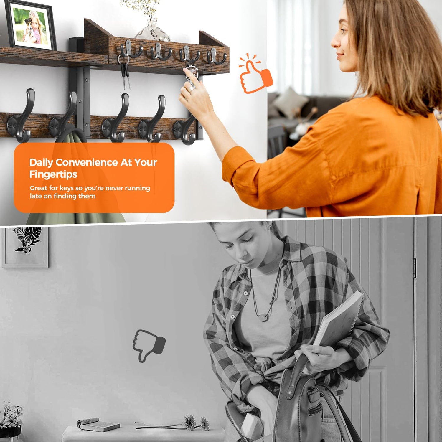 - 【4-in-1 Organization】This wall coat rack with hooks combines a key holder, mail organizer, and display shelf, making it perfect for storing jackets, backpacks, dog leashes, and more; The top shelf adds extra storage for decor or small essentials