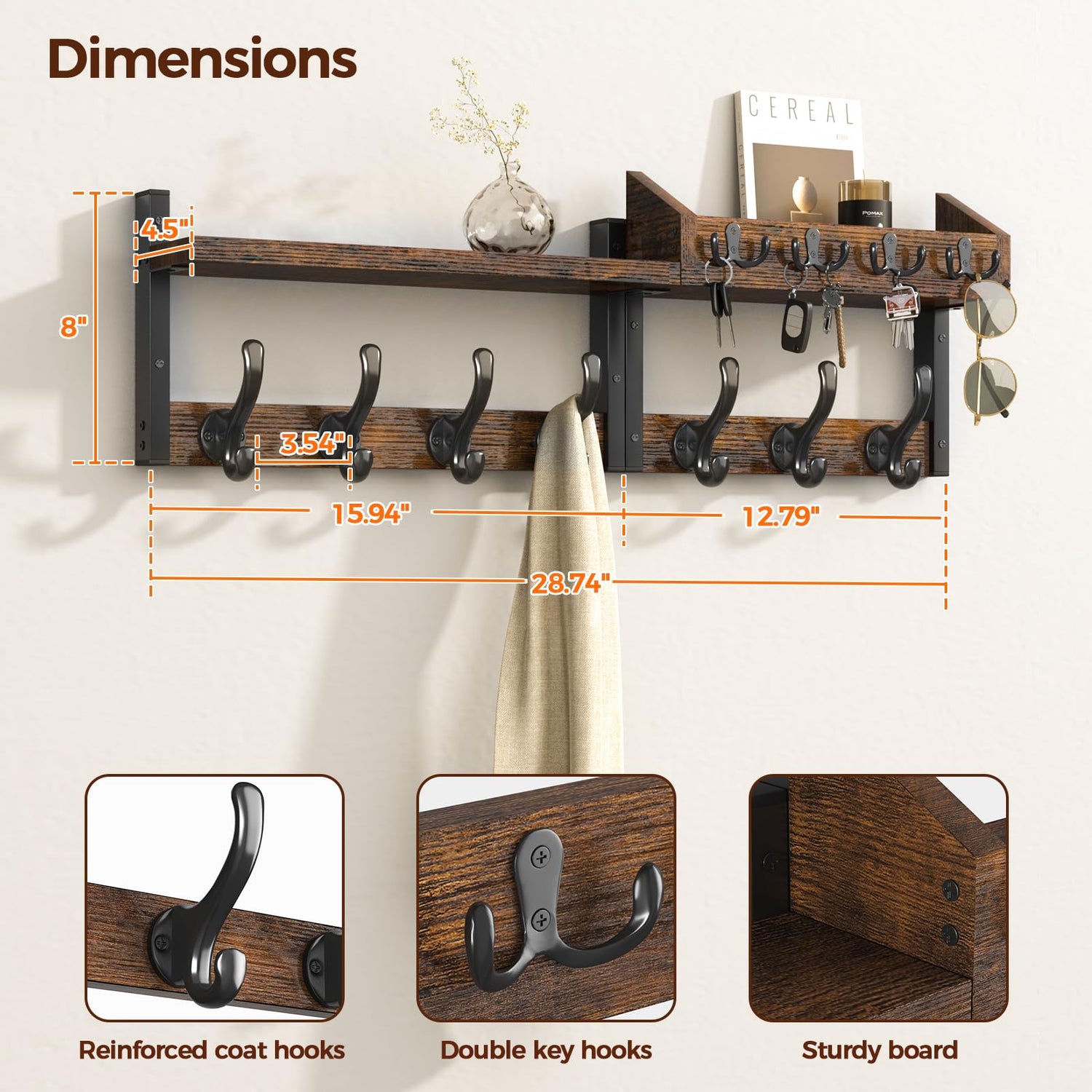 - 【Sturdy & Lasting】Crafted from quality wood and metal, this coat hooks with shelf is built to last; Reinforced 7 coat hooks and 4 key hooks ensure a reliable hold for heavy coats, purses, or towels; Dual-hole mounting provides extra stability