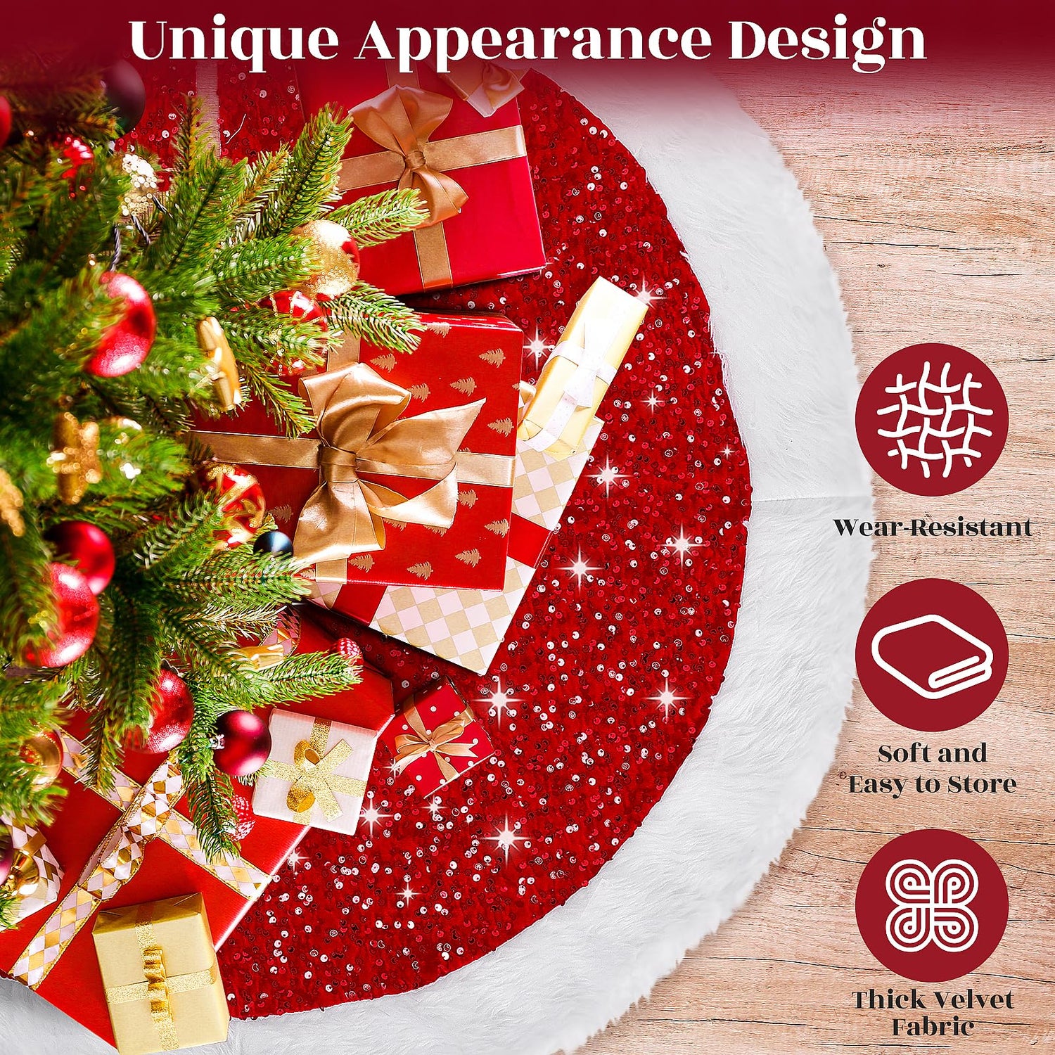 - [EXQUISITE DESIGN] The EverMerry Christmas Tree Skirt features a luxurious red velvet inner circle adorned with sparkling sequins, complemented by a cozy plush white outer circle, making it a unique and eye-catching addition to your holiday decor