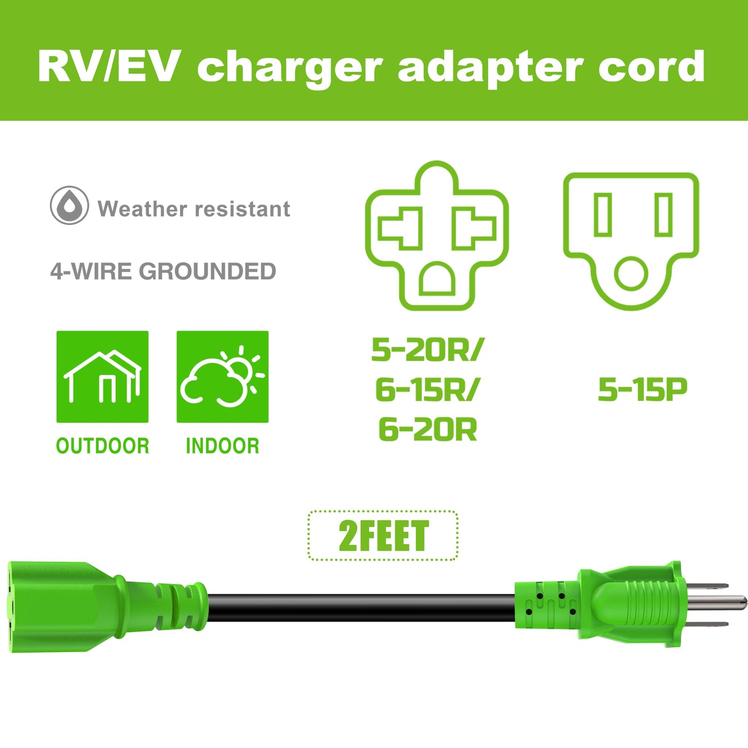 EVMaster 12AWG 15 Amp Household AC Plug to 20 Amp T Blade Adapter Cable, Nema 5-15P to 5-20R/6-15R/6-20R EV Charger Adapter Cord AC Power Adapter Cable, 4 in 1 AC Adapter, 2 Feet