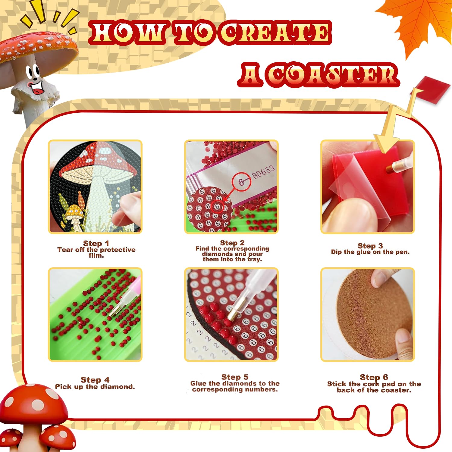 - Easy To Use Diy Enjoyment: Diamond painting mushroom coasters packs designed for both beginners and experienced adults, this diamond painting kit for adults is straightforward and simple to use. Just follow the provided instructions, peel off the protective film, apply the diamond dots for adults to the numbered sections on the coaster, and enjoy creating beautiful diamond paintings coasters kit without worrying about the diamonds falling off
