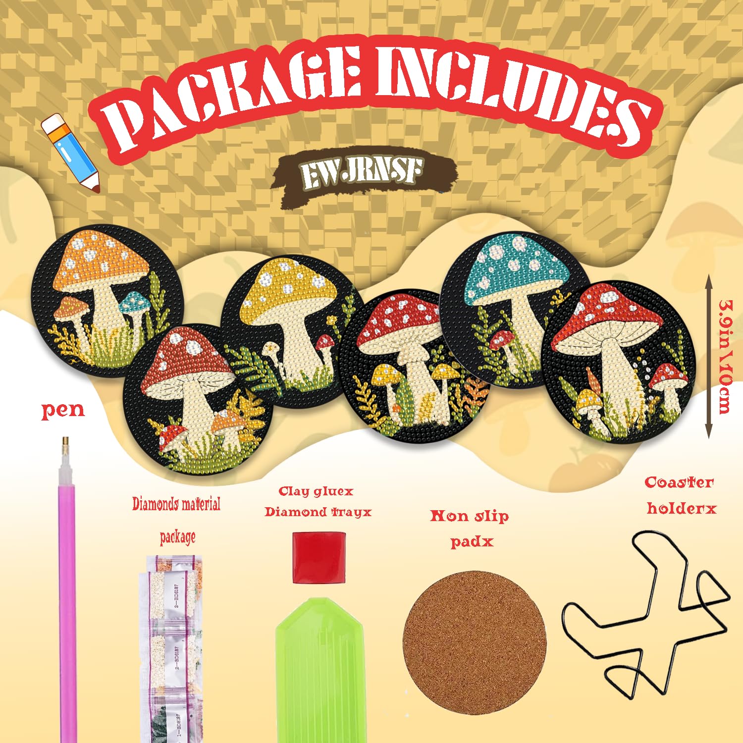- Mushroom Diamond Art Kits for Adults: This kits includes 6 pcs mushroom diamond painting coasters kits and cork pads, diamond dots arts, diamond painting pens, red glue clay and plastic trays. For each kit we'll provide 30% diamond more than need this kit