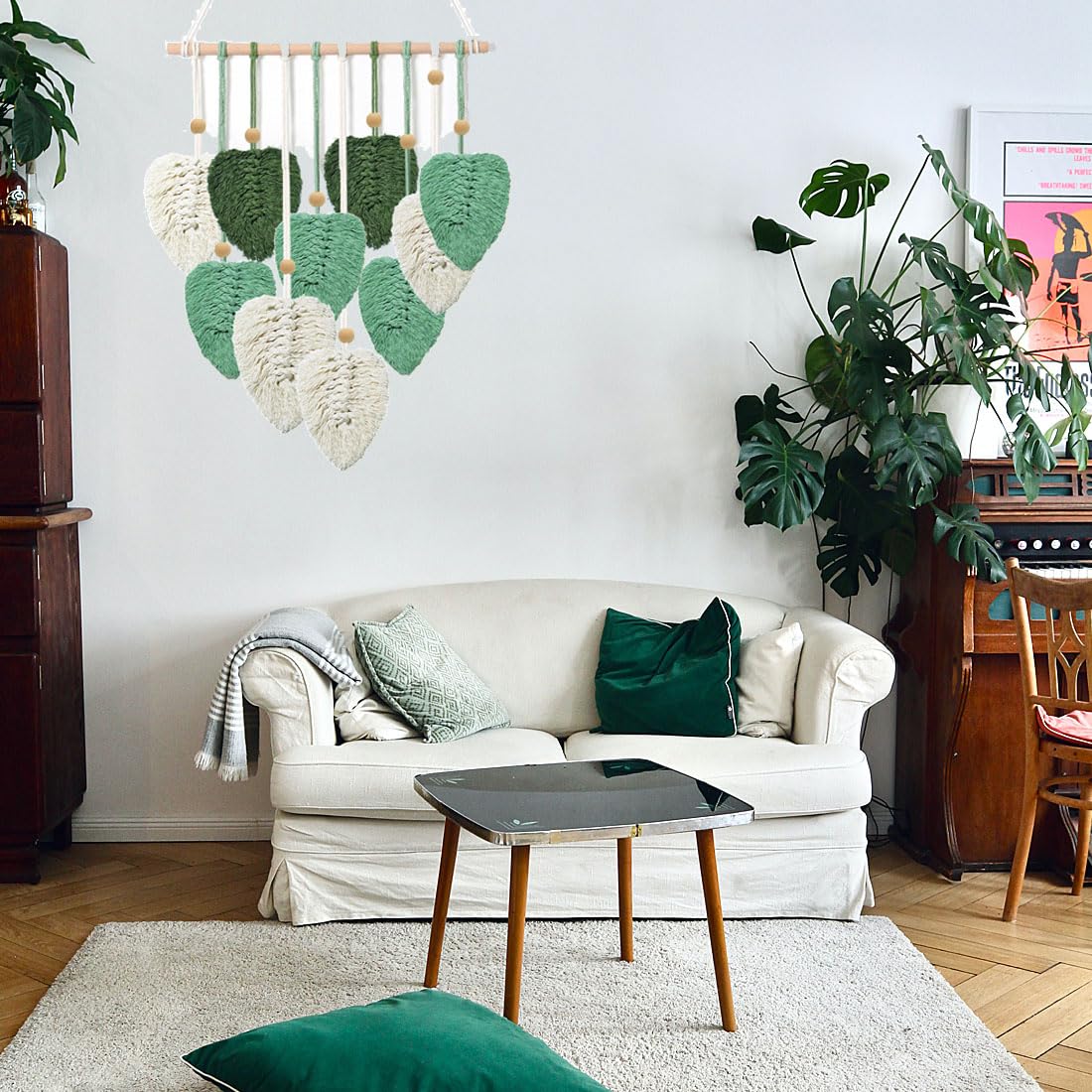 - MACRAME WALL HANGING - The design features knotted macrame leaves in various colors, creating a beautiful garland that can be hung on a wall, above a bed, or even as a backdrop for a special event