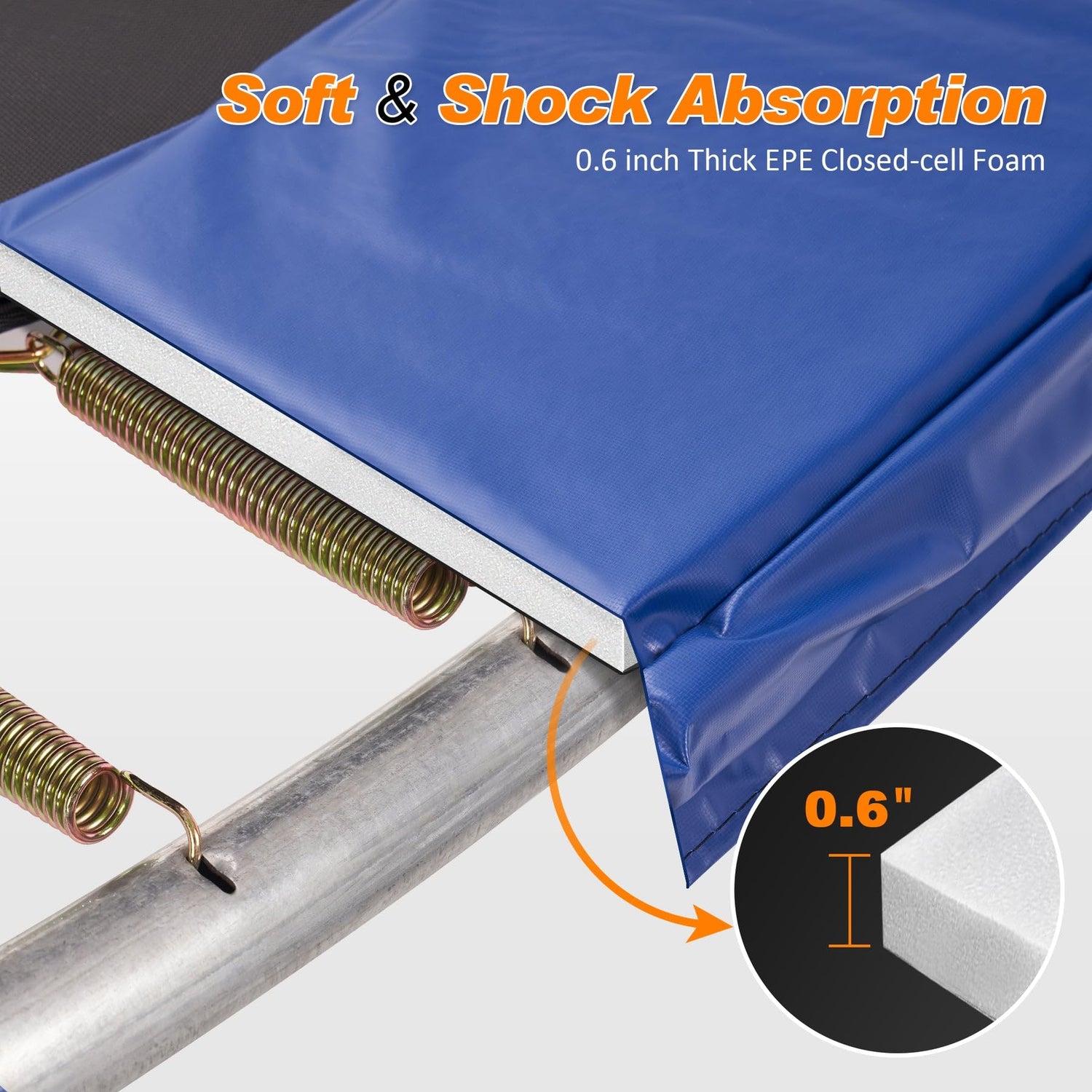 - Foam Padded, Safety & Shock Absorption: 0.6-inch thick EPE closed-cell foam inside, which helps to absorb the impact of a fall, ensuring that you enjoy a safe and sturdy jumping experience. In addition, the spring cover pad also provides you with a cozy resting space