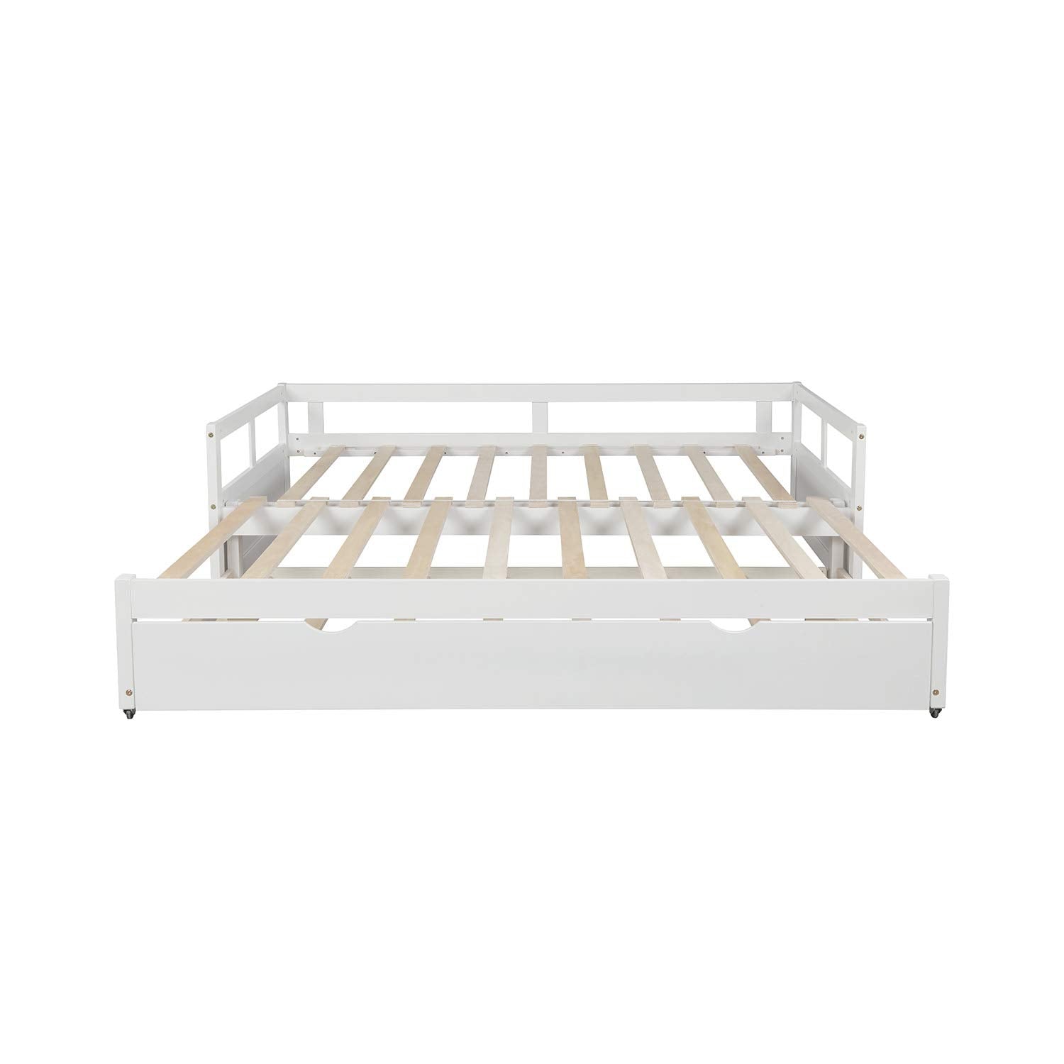 Extendable Daybed with Trundle Beds, Wood Daybed Frame with Pull Out Trundle, Twin to King Design Extending Daybed for Kids Girls Boys Teens Adults, No Box Spring Required, White
