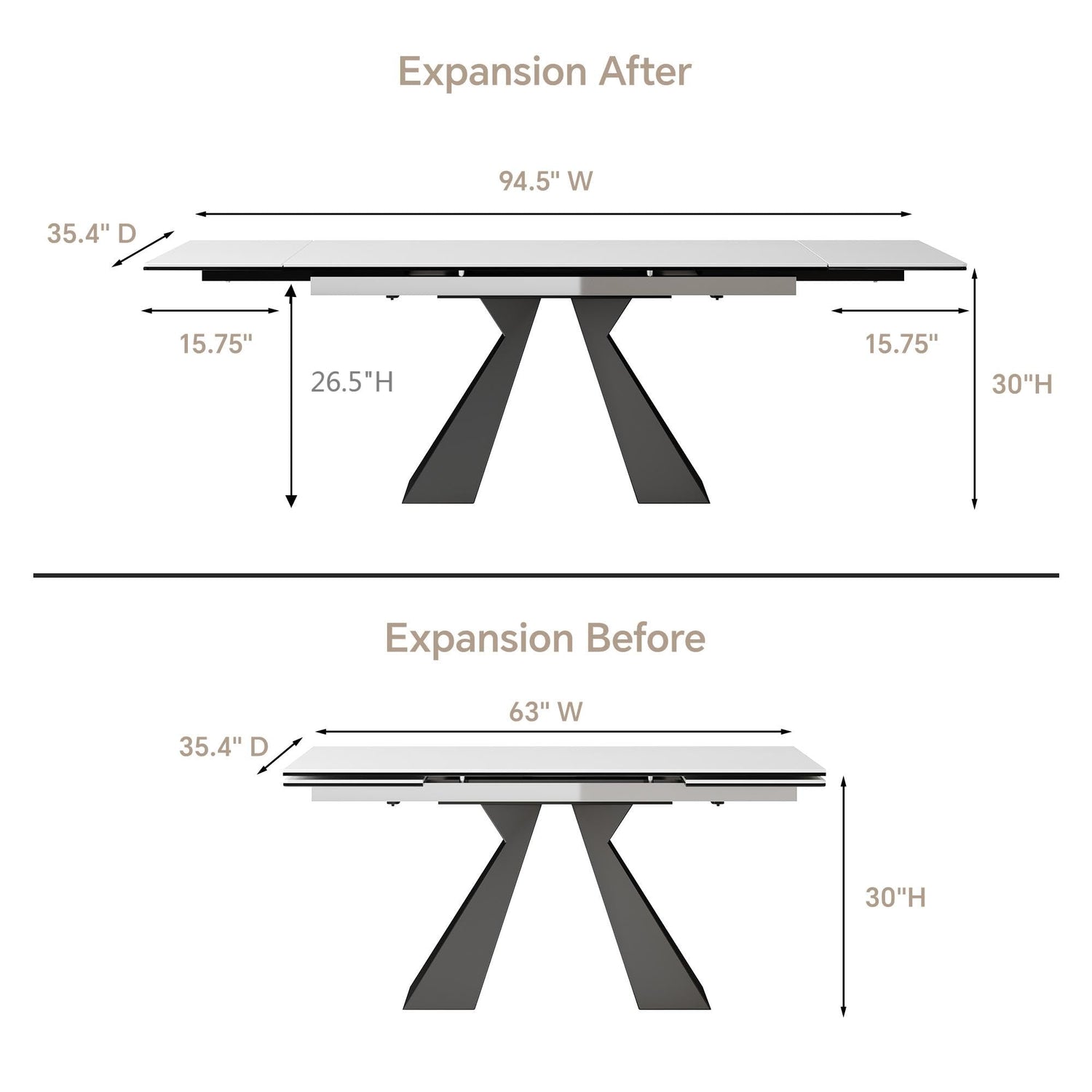 - ☞ Product size: 35.4"D x 63"(+31.5 ")W x 30"H Table material: tempered glass + sintered stone(rock plate);Base material: carbon steel; Color: white top with dark grey legs;Net weight: 260 pounds; Assembly: requires simple assembly.