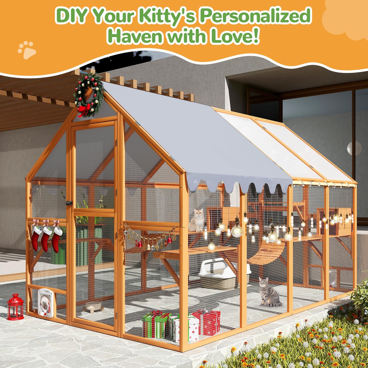 - 【Effortless Walk-In Design】Featuring a 60-inch tall entrance and 2 small doors. each small door features 4 adjustable modes: fully locked, free entry and exit, one-way entry only, and one-way exit only. this walk-In large catio outdoor cat enclosure simplifies provide a easy and safe way to feed, clean, interact and enjoy nature