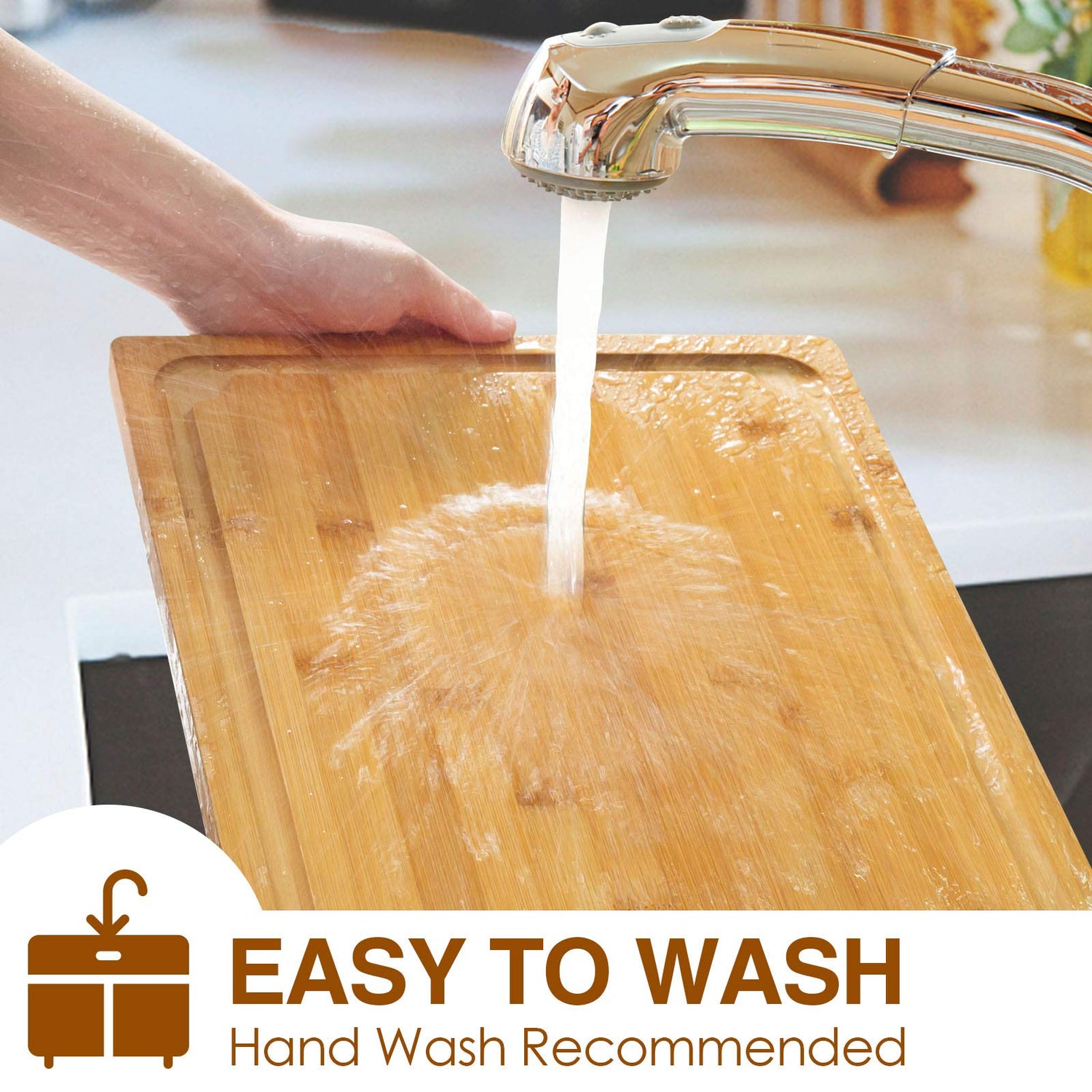 - 【EASY TO MAINTAIN】Cutting boards made of bamboo, doesn't absorb stains from your foods, unlike most cutting boards do. Just a simple washing and monthly treatment with oil will help preserve the beauty of your bamboo for many years to come.