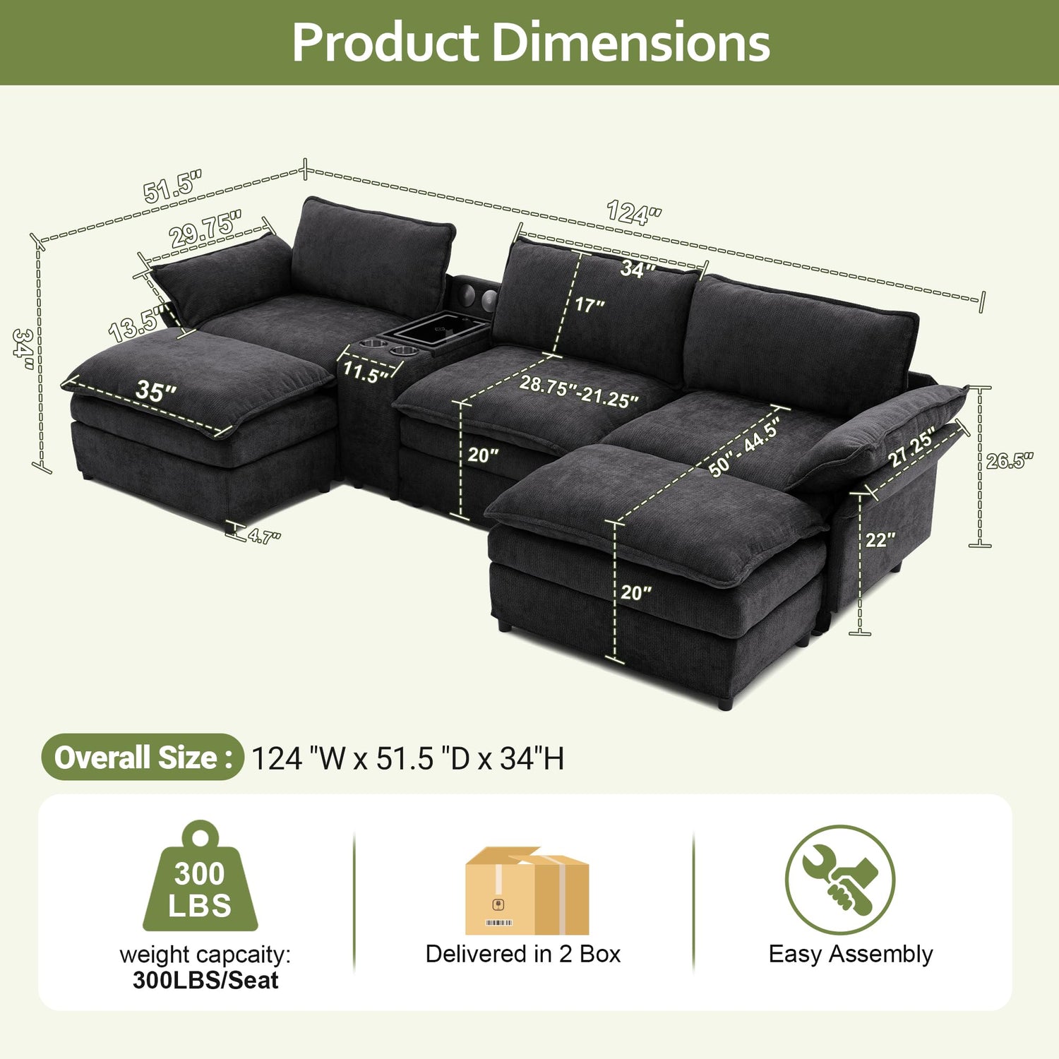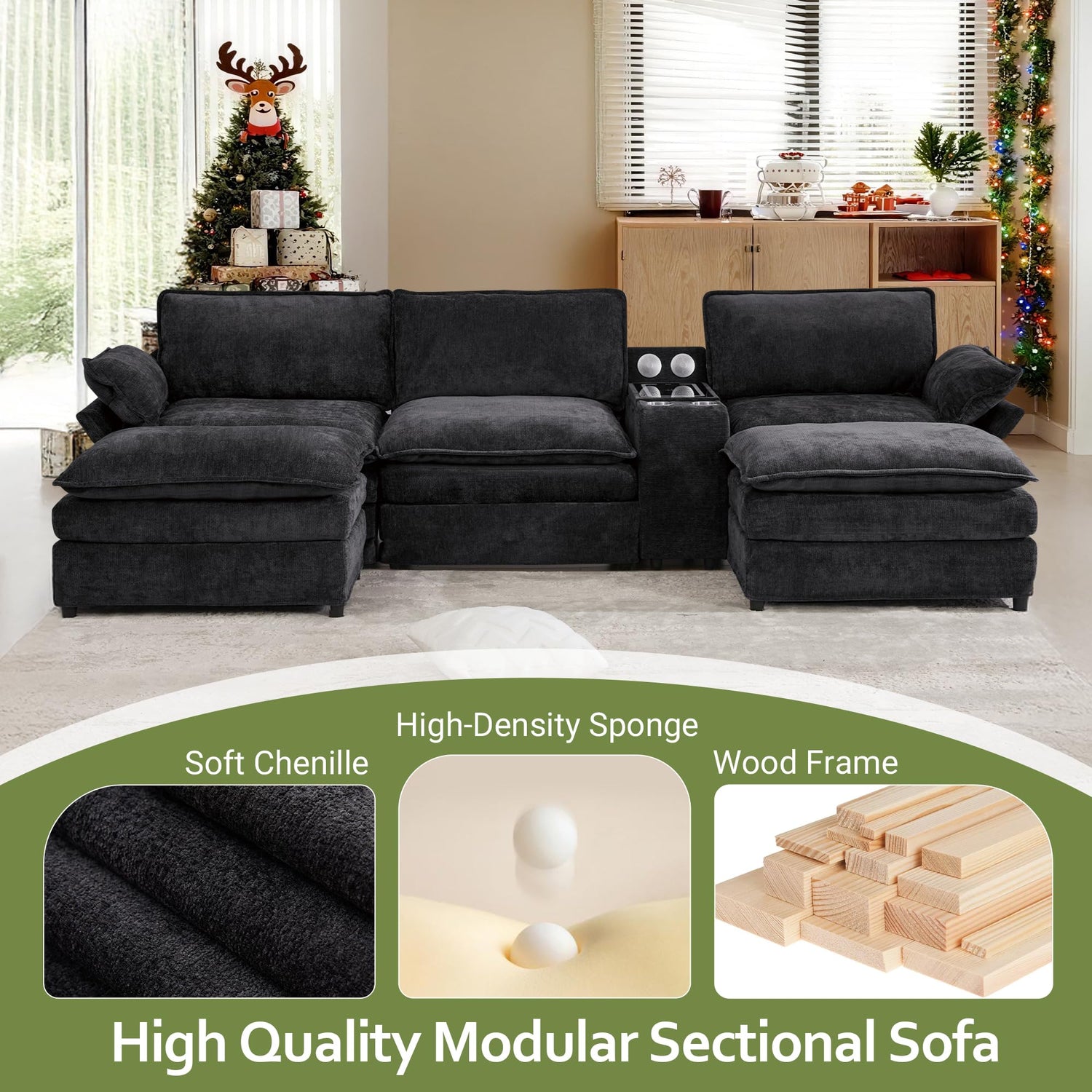 EYATZO 124" U Shaped Cloud Couch, Modular Sectional Sofa with Movable Ottomans, Modern Deep Seat Sofas for Living Room, Comfy Chenille Sectionals with Central Console & Bluetooth Speakers (Black)