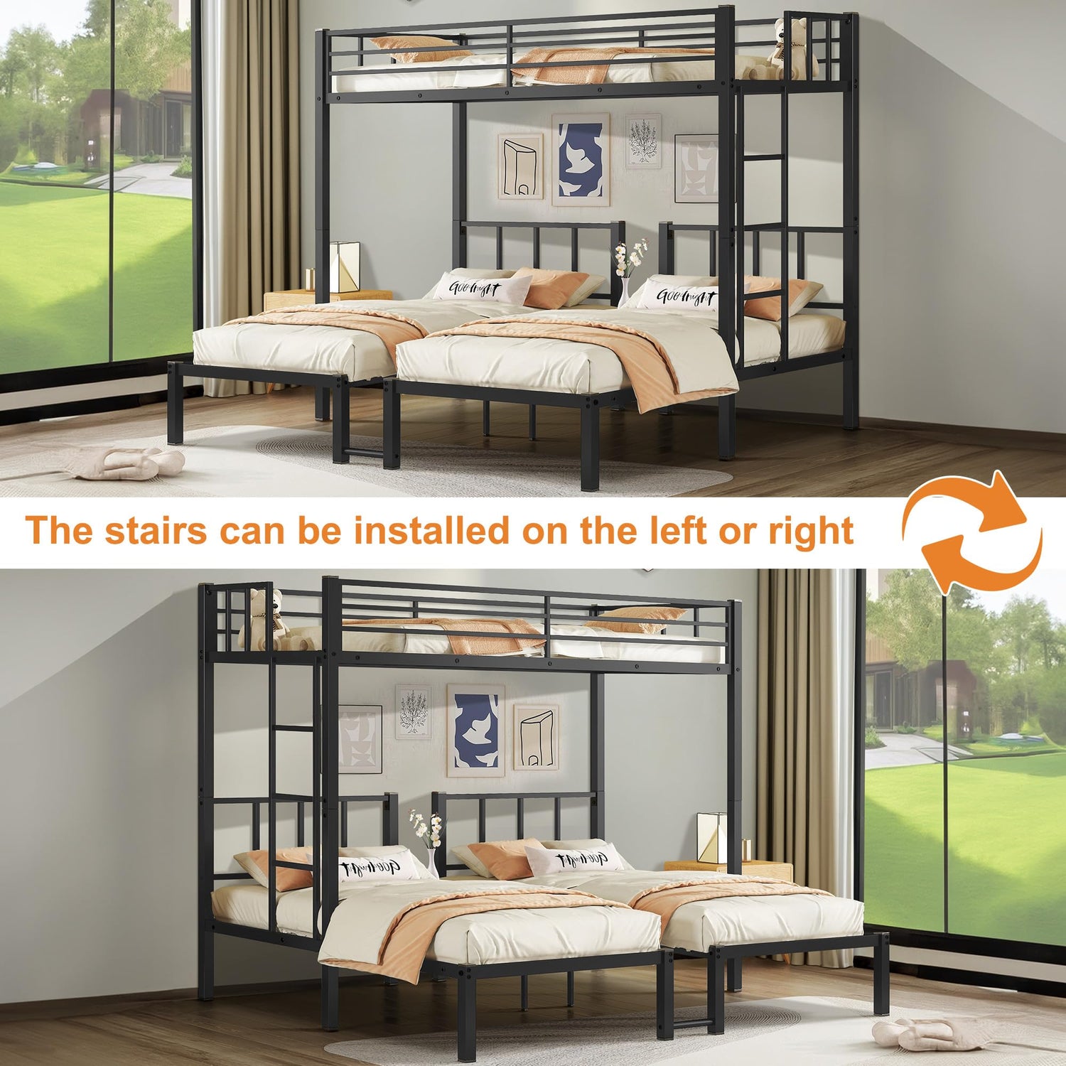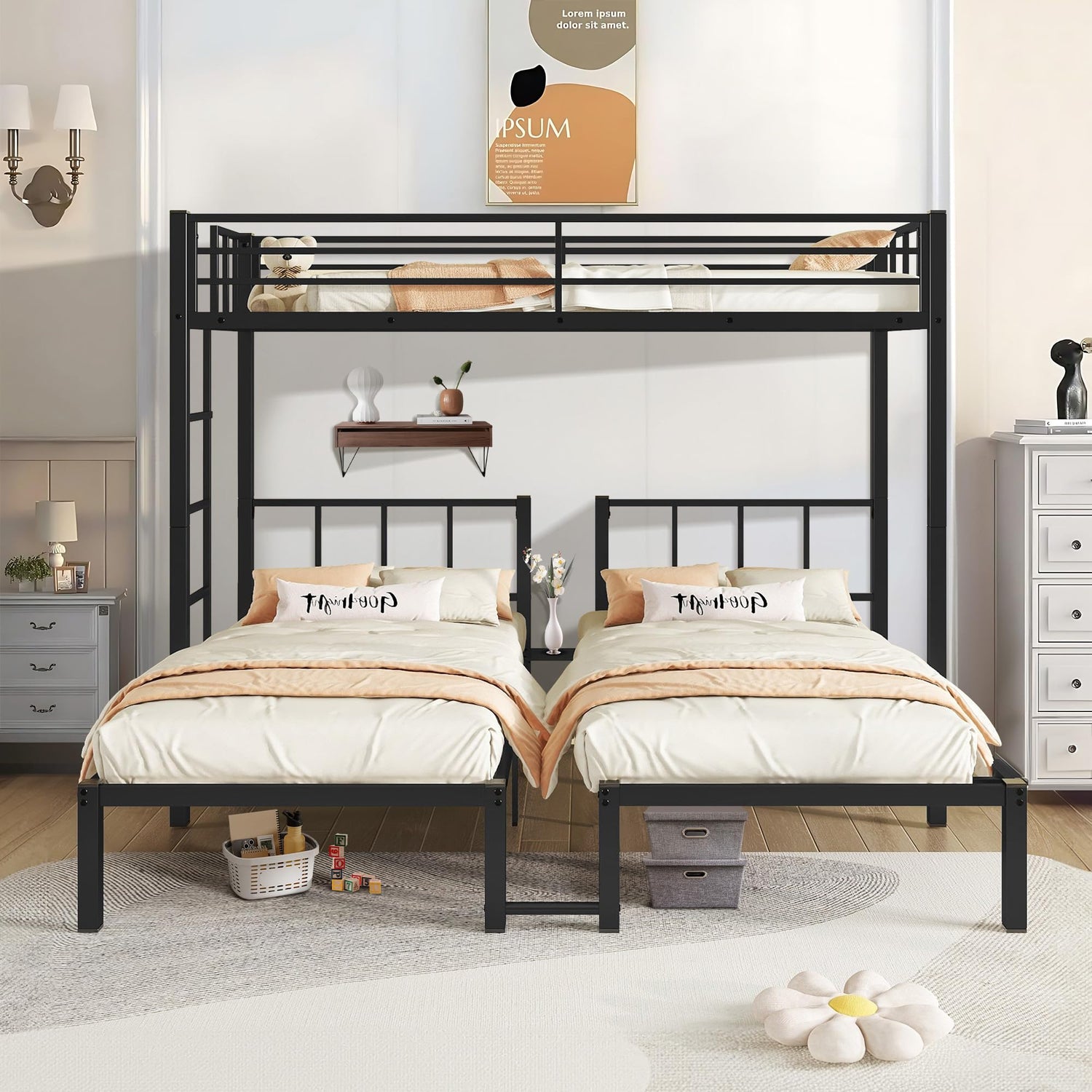 - STURDY CONSTRUCTION: This twin over twin bunk beds for 3 is built with heavy-duty, powder-coated metal for superior strength and rust resistance. The upper bunk includes full-length guardrails on all sides to prevent falls, while the ladder offers secure climbing. Steel slats support mattresses directly (no box spring needed).
