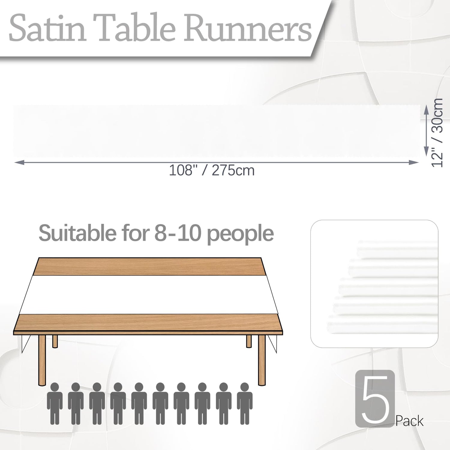 Eychei Set of 5 White Satin Table Runners, 12" x 108" Long Bright & Smooth Table Runner with Scalloped Edges, Satin Table Cloth Table Runner Decor for Wedding, Party, Banquet