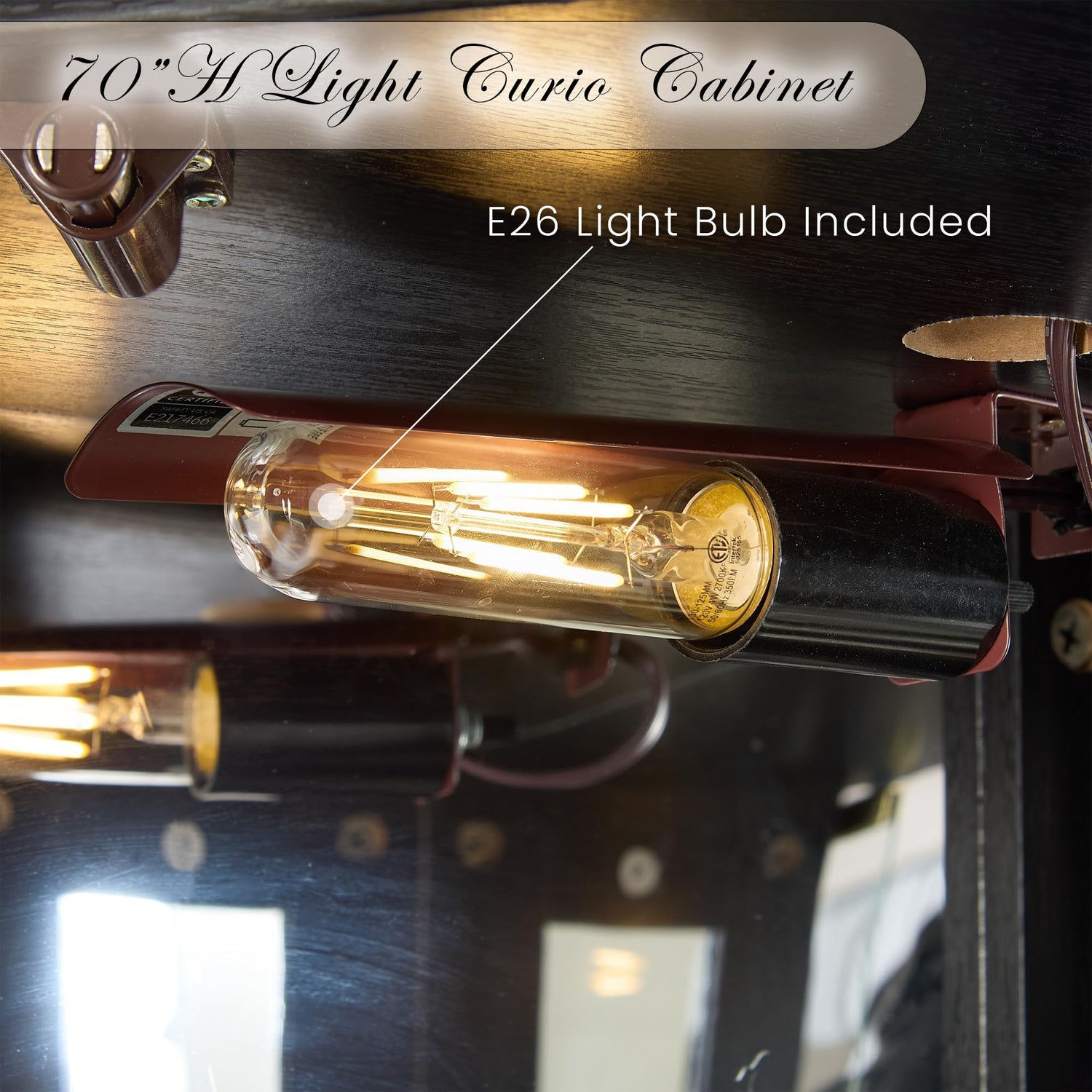 Eyisean 70" Lighted Glass Corner Curio Cabinet, Display Cabinet with Elegant Tempered Glass Door, China Cabinet with Light Bulb, Mirrored Back Panel, Rack for Living Room Storage (Black)