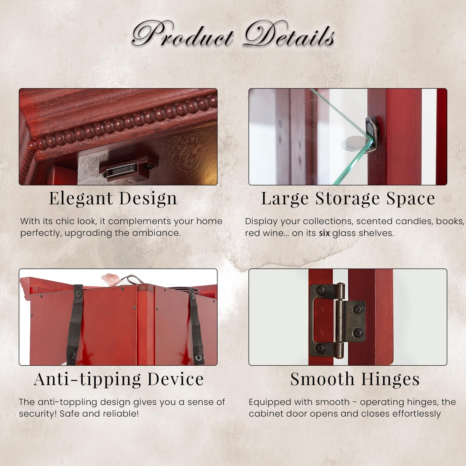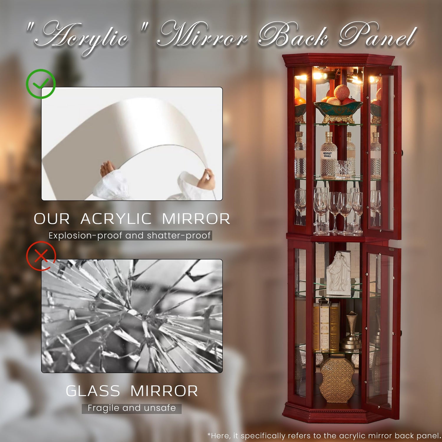 - [Elegant Display with Built-In Lighting] - Featuring 2 glass-pane doors, 4 glass side panels, and adjustable glass shelves, this cabinet offers a spacious and versatile display area. The built-in light and mirrored back panels enhance visibility, creating a stunning showcase for your books, wine bottles, family heirlooms, or decorative pieces. Transform any room into a gallery of your favorite treasures.