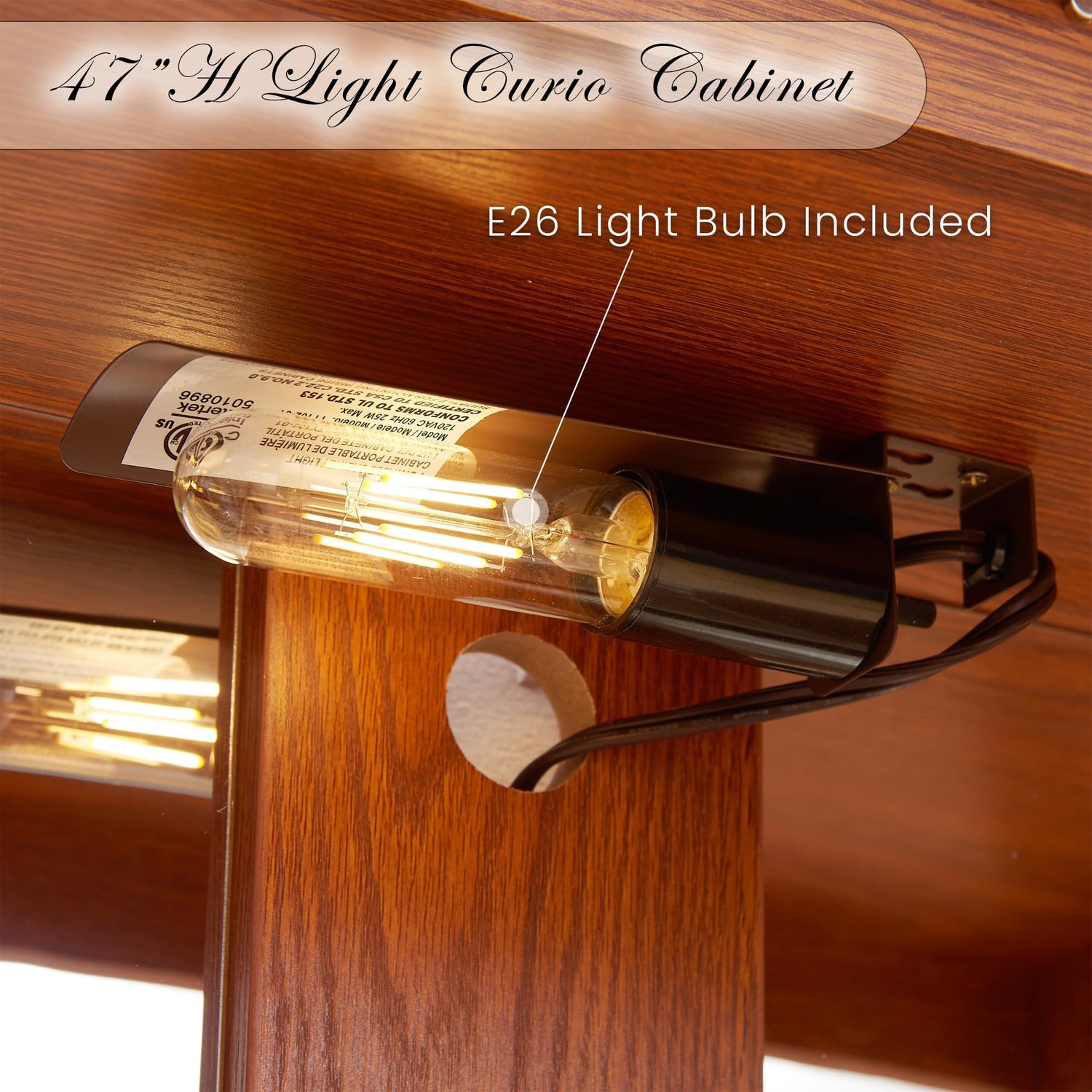 Eyisean Lighted Curio Cabinet 47" H China Cabinet with Tempered Glass Doors, 3-Tier Adjustable Shelves and Acrylic Mirrored Back Pane, Glass Display Cabinet for Living Room (Dark Oak)