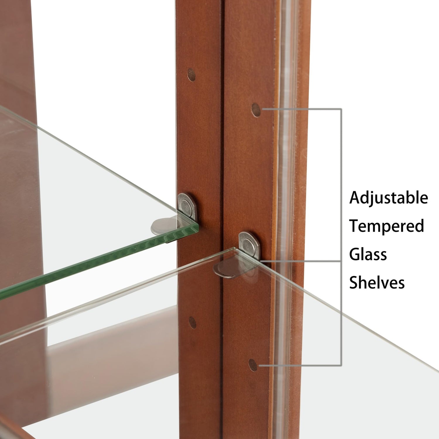 - [Flexible Storage, Endless Possibilities] This curio cabinet comes with 3 shelves and 1 open area, providing you with diverse storage choices. It has 1 fixed wooden shelf supporting up to 30 lbs, perfect for heavy items, and 2 adjustable tempered glass shelves, each capable of holding 15 lbs, great for delicate collectibles. Whether it's bulky antiques or fragile figurines, you can store them just as you like.