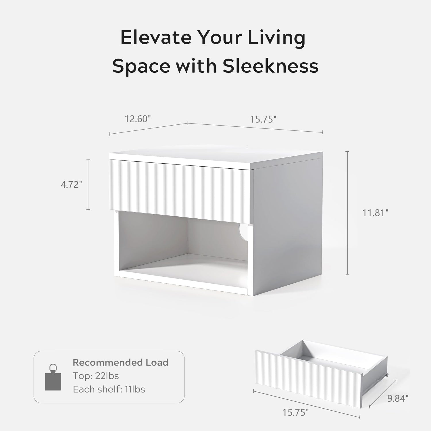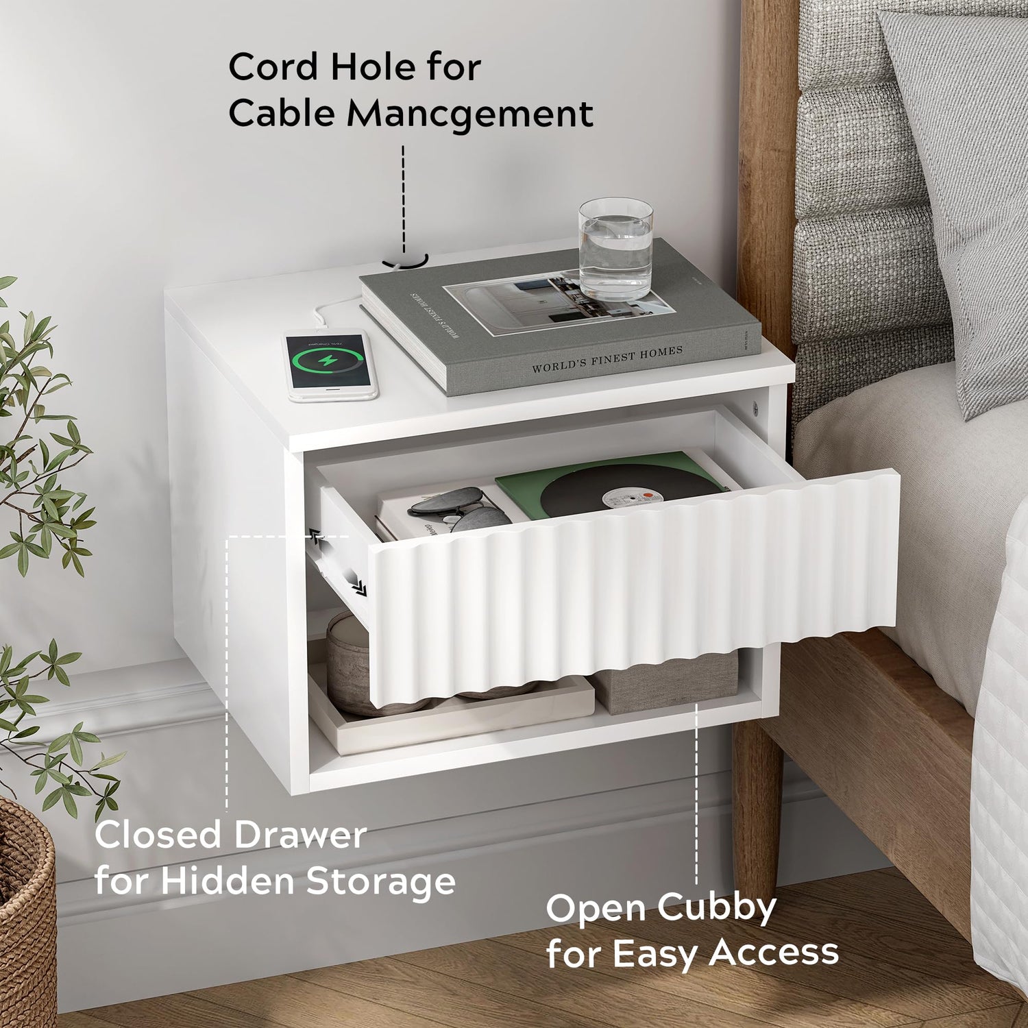 - CONVENIENCE DESIGN: The cord hole of this small wall mounted nightstand allows for easy cable management, while the closed drawer and open space provide suitable storage space for all your bedside items. With its solid wall-mounted design, the sturdy construction brings you greater weight support