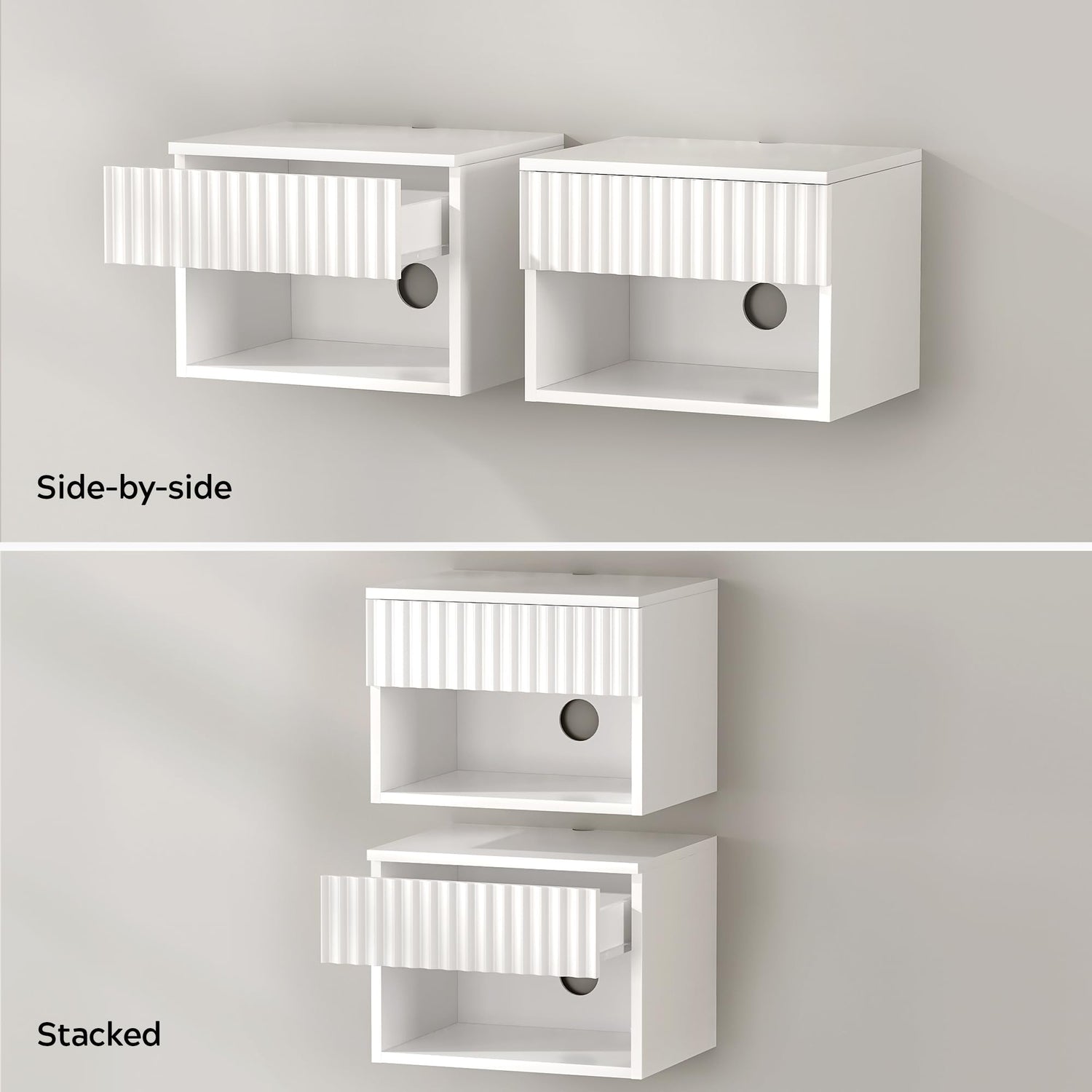 Details: EYYTHUNG Fluted Wall Nightstand Set of 2 with Drawer, Modern Floating Night Stand with Fluted Door and Open Storage Shelf Wall Mounted Bedside Table for Bedroom Bathroom Entryway, White
