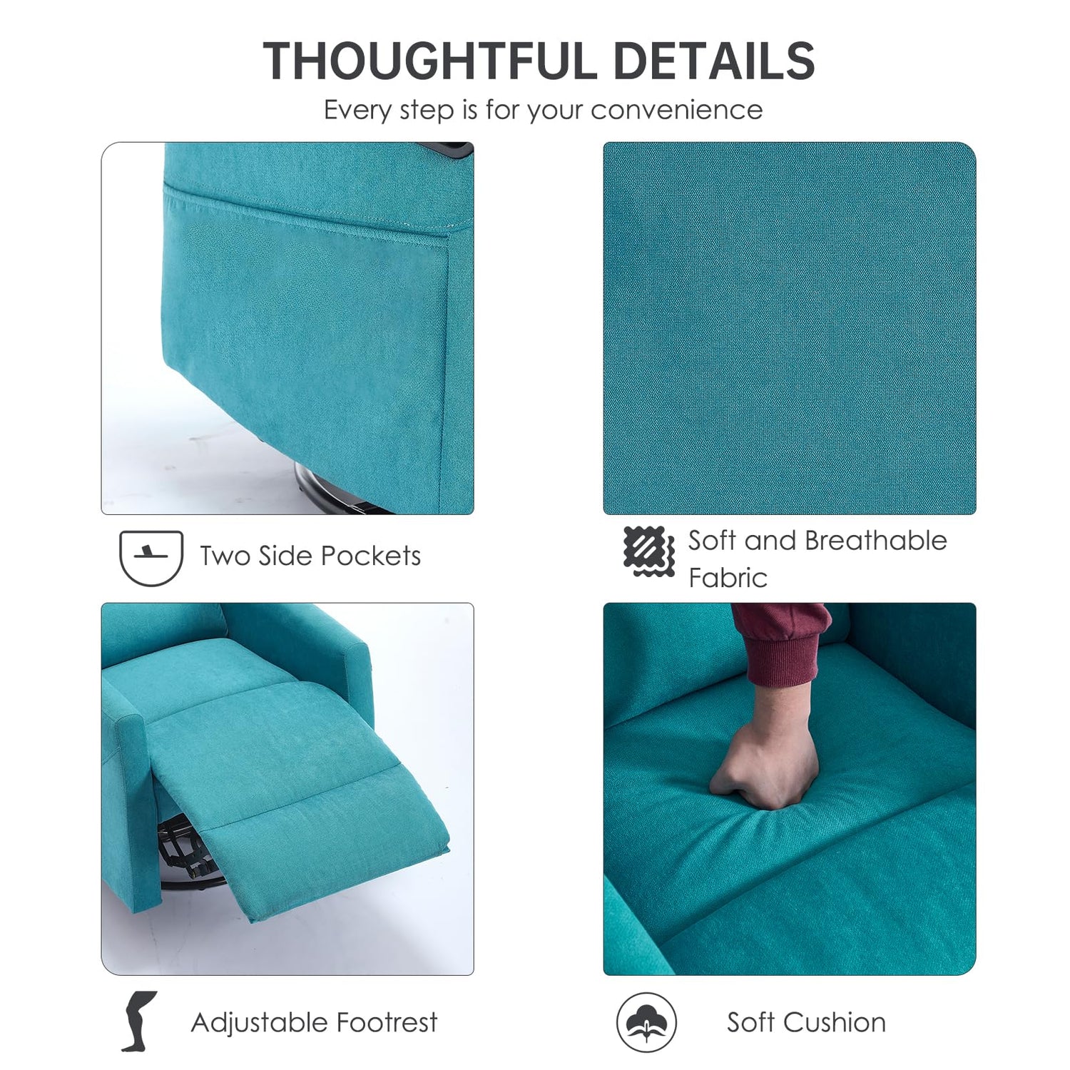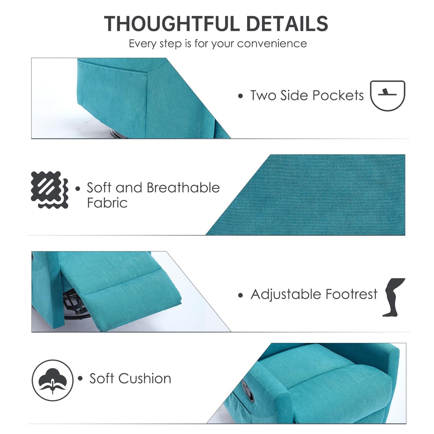 - Manual Recliner Chair With Footrest: After pulling up the handle, the footrest will automatically pop out. Place your hand on the armrest of the rocker recliner chairs and push the modern recliner chair backwards using your weight (Maximum 90°, 120°, 155°). The reclining angle of the small recliners will move with your center of gravity.