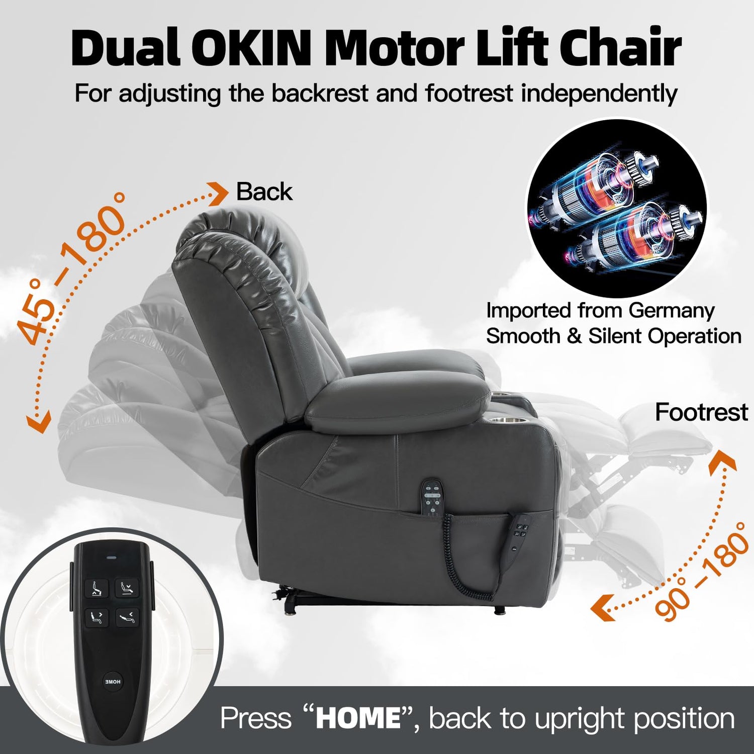 - Upgraded "HOME" Button:Just press the "HOME" button, and you will return to the upright position. And don't worry, as the tilt position rises, your back will first move to ensure your security. The position locking of the lift chairs for elderly is infinite.