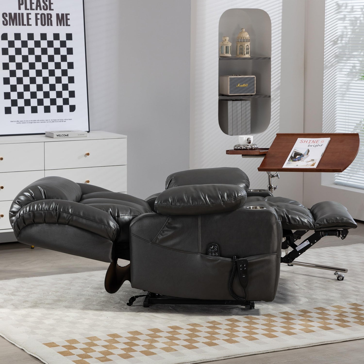 - More Than You Want: This heated massage recliner is made of breathable leather, which is durable and scratch resistant. Two stainless steel cup holders are provided for your drink. Pockets on both sides of the dual motor recliner chair for elderly allow for small items within reach.
